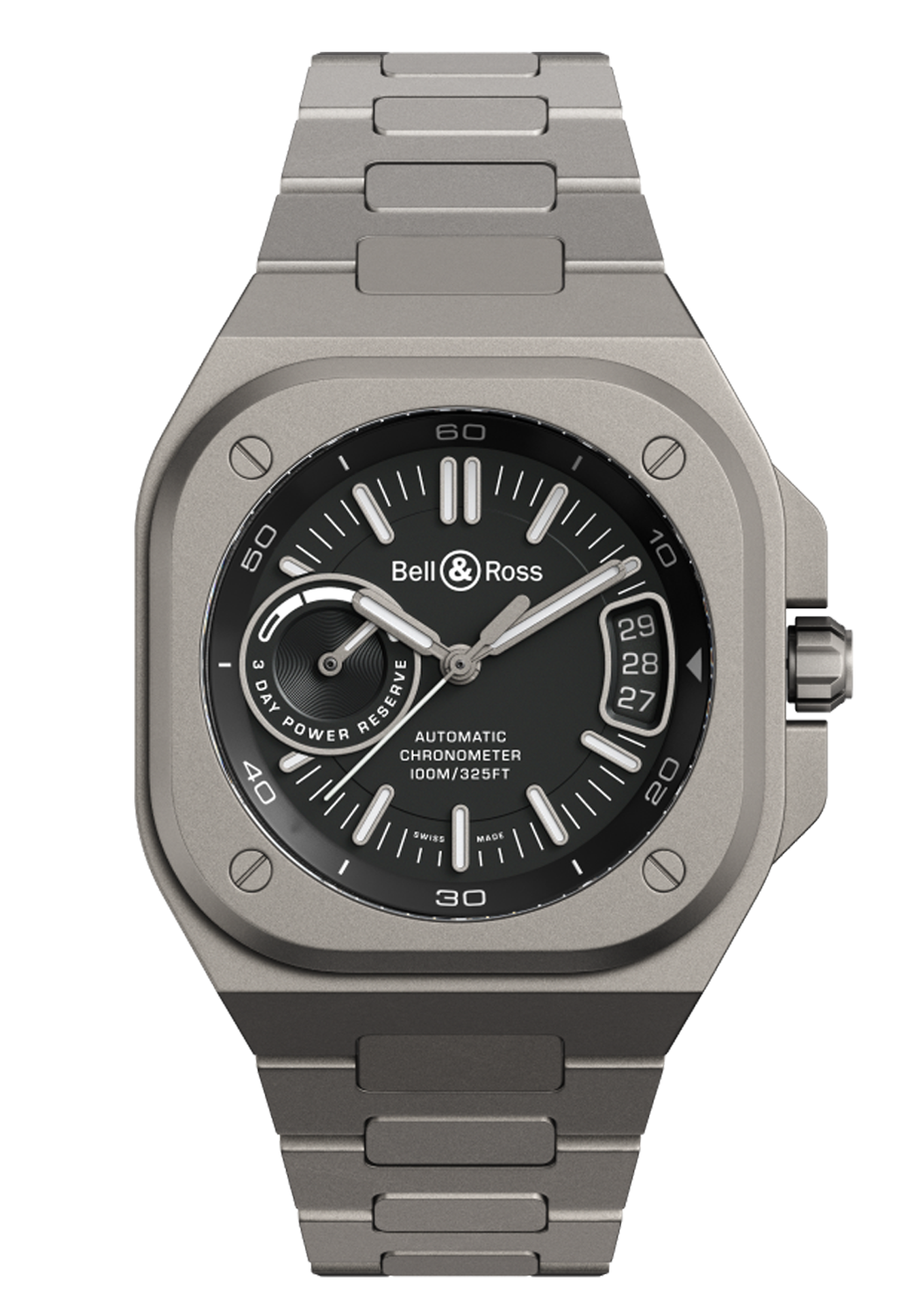 The BR-X5 Black Titanium is powered by the BR-CAL.323 self-winding mechanical movement, ensuring COSC-certified chronometer accuracy. With a substantial 70-hour power reserve and a quick date-correction feature, this exceptional timepiece comes with a five-year guarantee, epitomizing reliability and precision in luxury watchmaking. Titanium's remarkable attributes make it a perfect choice for Bell & Ross, offering unmatched practicality and performance, and setting a new standard in luxury watchmaking materials. Prized in aeronautics for its robust yet lightweight nature and weighing only a third as much as steel, titanium is regarded for being hypoallergenic, non-corrosive, and non-magnetic.