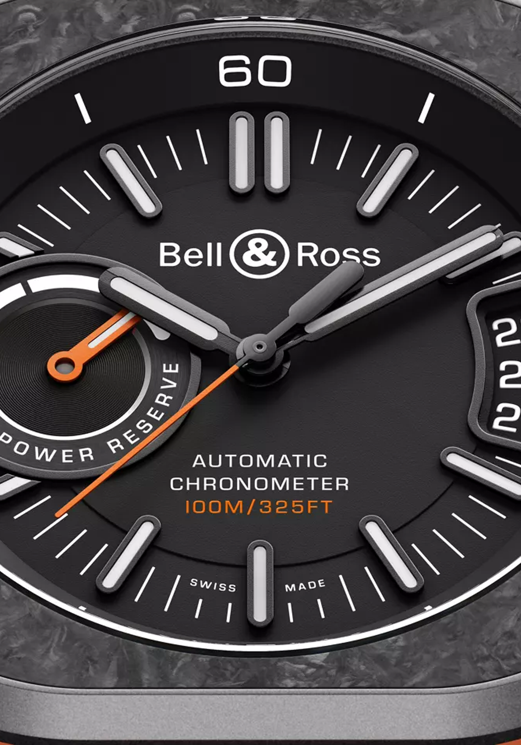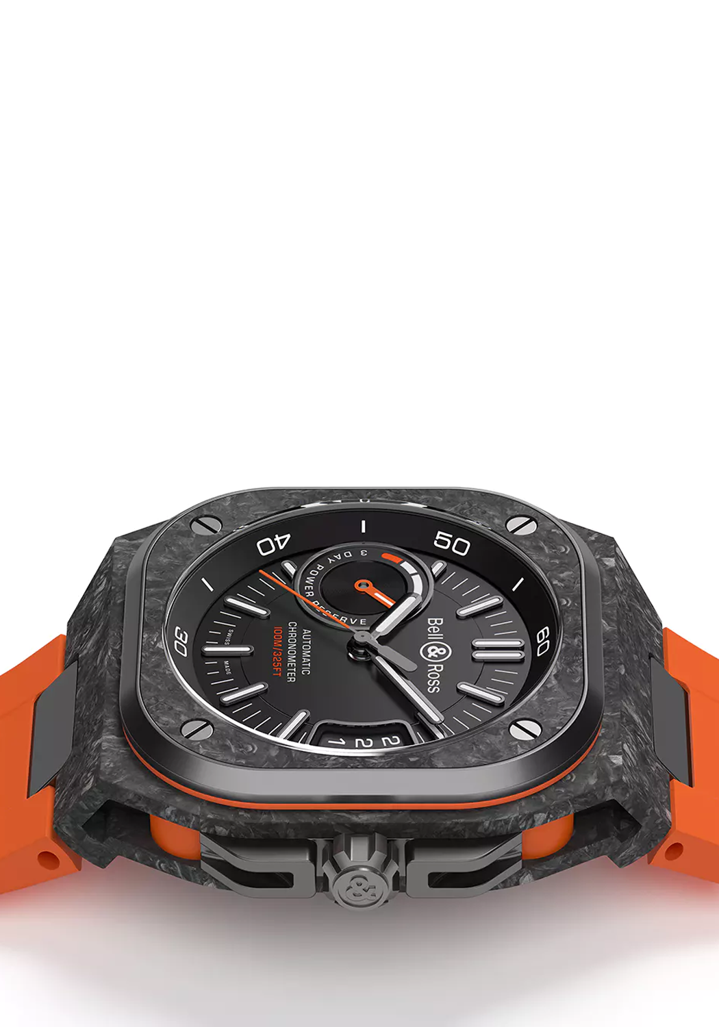 The BR-X5 Carbon Orange brings together two highly advantageous features: an oversized vertical date and power reserve indicator. This distinct double display is both readable and aesthetically pleasing, making the BR 05 family instantly recognizable upon glance. With its 41 mm carbon and titanium case, 100 meter water resistance and approximate 70 hour power reserve, the BR-X5 is an epic powerhouse of a watch ready for any adventure that awaits.