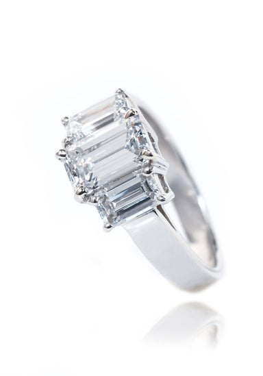 This Platinum Trinity Emerald Cut Diamond Ring is more than just a piece of jewelry; it’s a narrative of timeless love and commitment. At the cente...