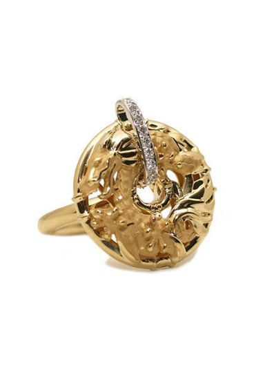 This elegant cocktail ring by Carrera Y Carrera is flush with intricate detailing. A donut shaped disc of yellow gold shows off an Asian inspired d...