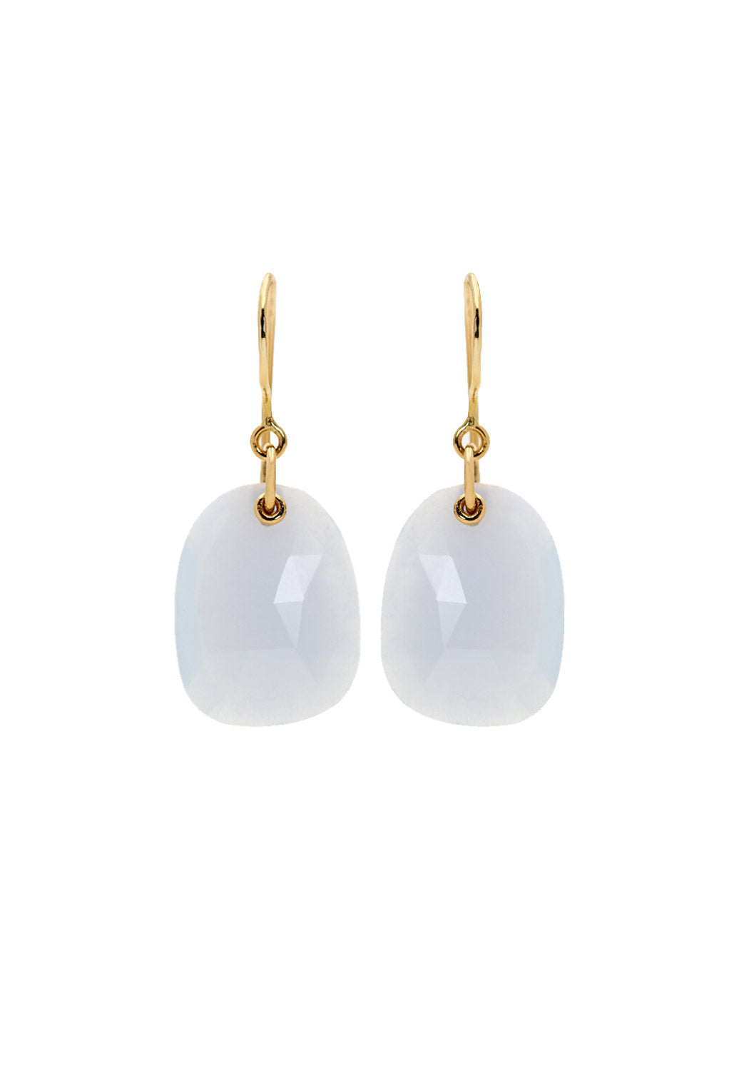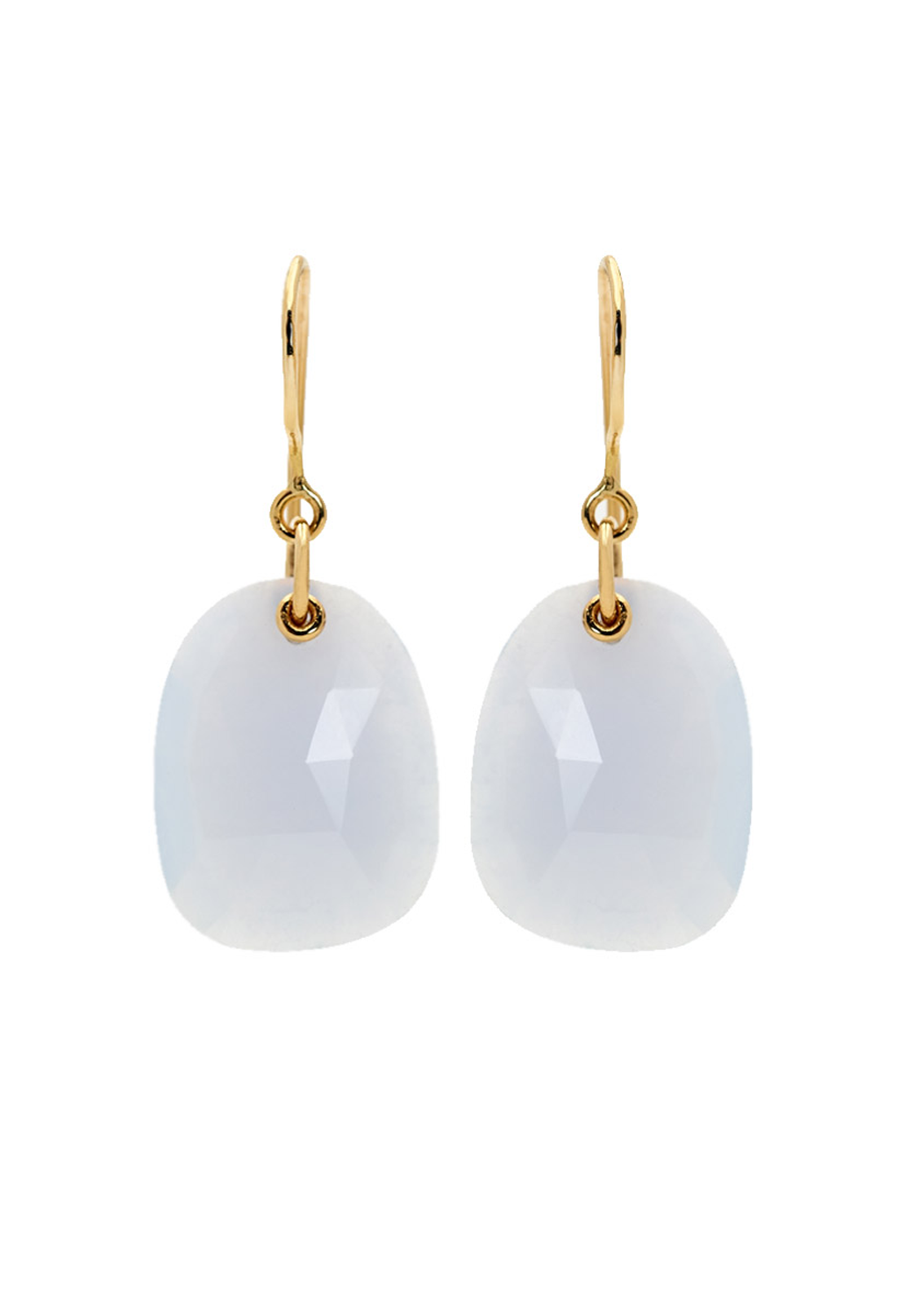 These dreamy Anne Sportun hook earrings feature sumptuous milky chalcedony suspended from petite 18k yellow gold rings. The creamy bluish lavender hued gem is embraced as the stone of harmony. It is used as a protection stone against negativity and to bring forth inner balance.