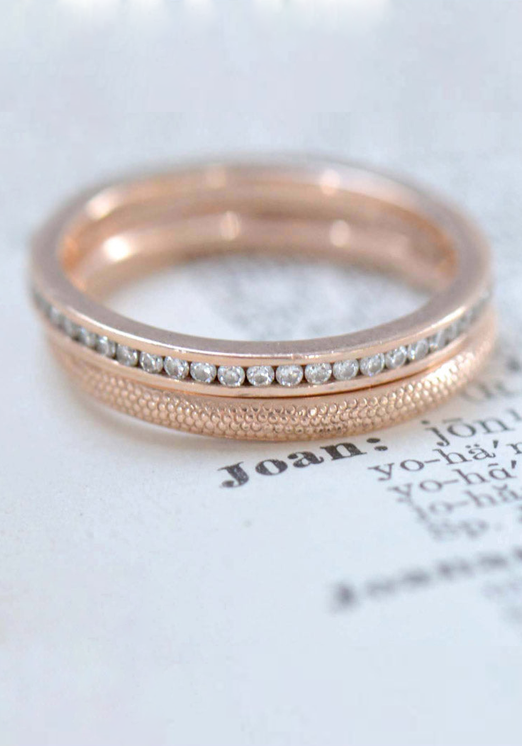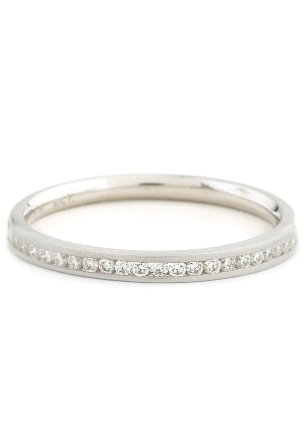 Pristine white gold with diamonds sets the stage for a single row of channel set brilliant white diamonds on this gorgeous Anne Sportun mini diamond half band. Wear this as a wedding band to compliment an Anne Sportun engagement ring for a truly unique bridal set. This diamond eternity band can also be worn individually for a simply elegant look, or mixed and matched to create a unique ring stack. This band is also available as a full eternity band and in different metals, call for availability.