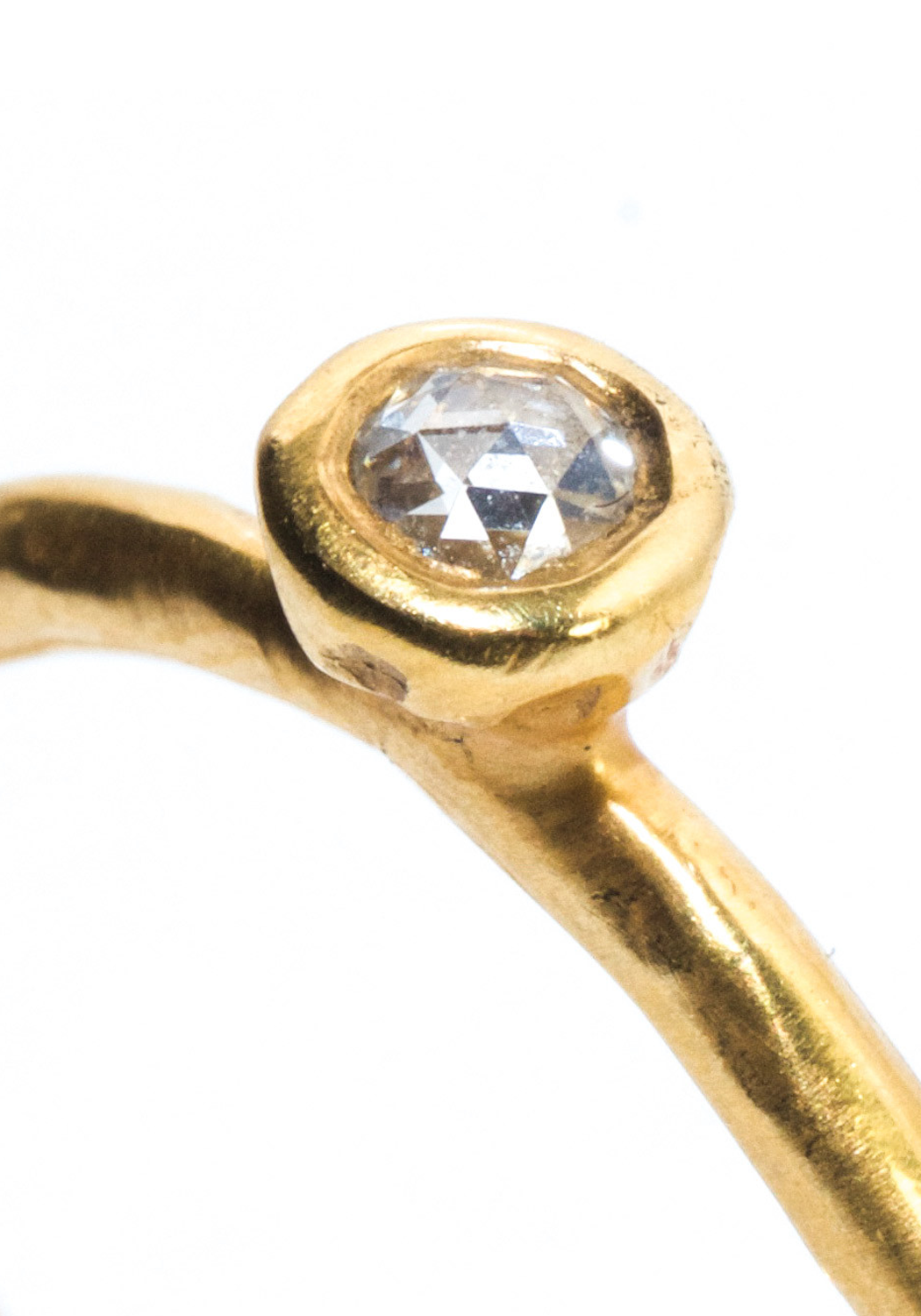 This delicate and feminine ring features a petite solitaire rose cut diamond hugged by hammered 18k yellow gold. The texture of the gold ring exudes understated elegance with its diamond focused design. Available in a size 6.25.