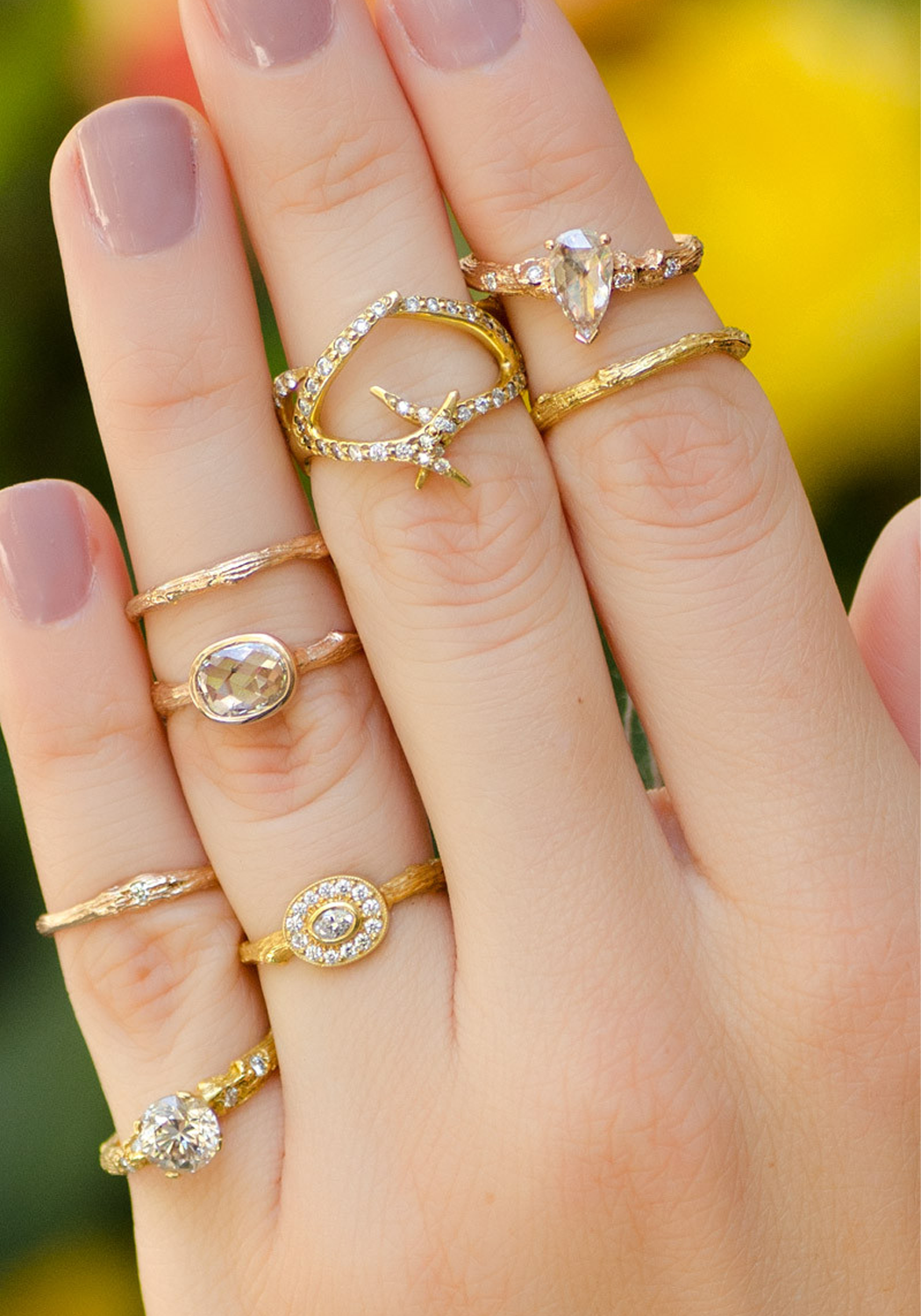 The K. BRUNUNI Objects Organique collection embraces a love affair of Earth, Air, Fire, & Water. Whimsical and poetic, Katey’s signature collections include: Twig, Vertebrae, DNA, Skipping Stones, Spider Web, Objects Organique, Spirit Animals and Body Armor. Inspired by nature, her jewelry is made with poetry laced in its shapes.