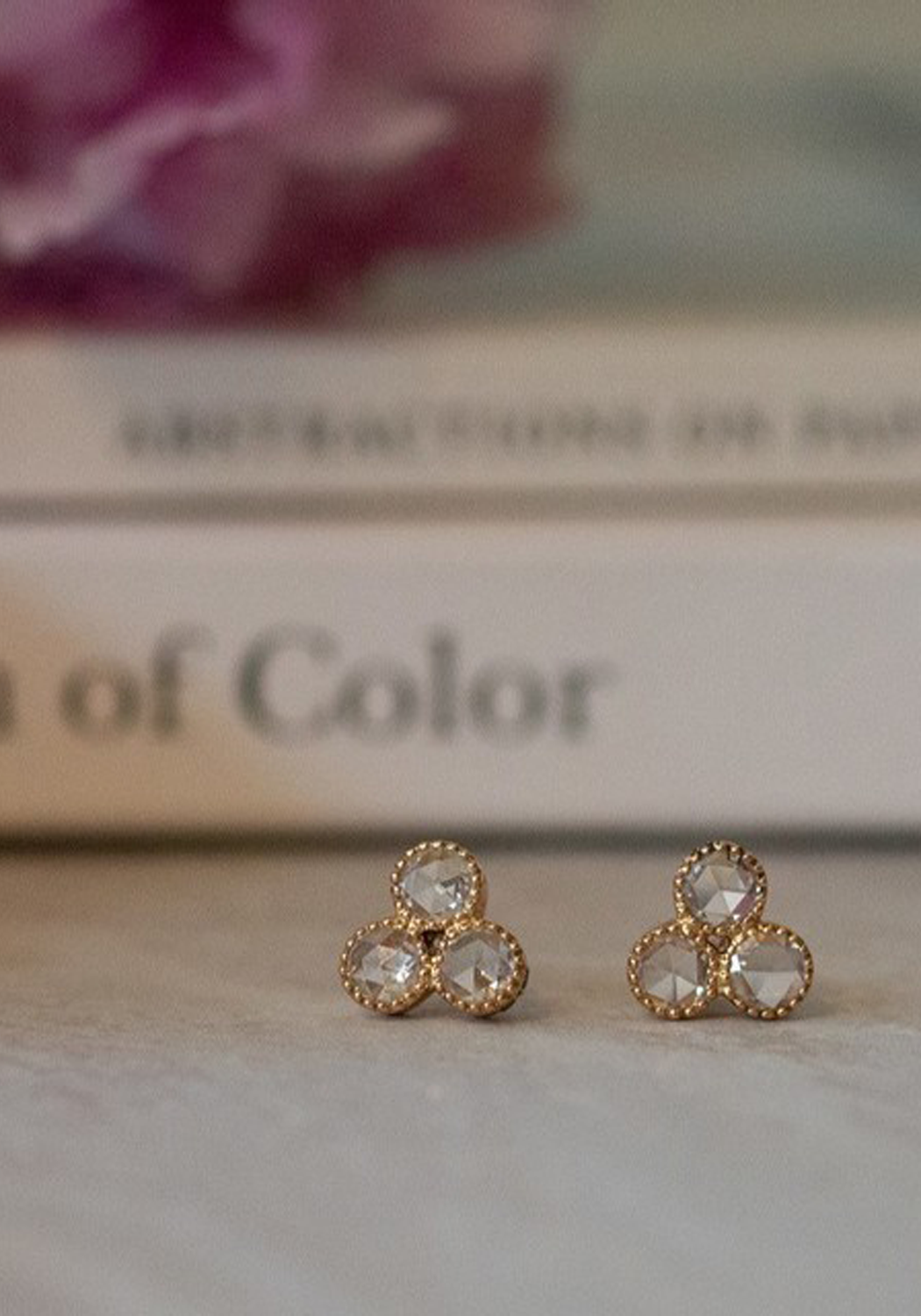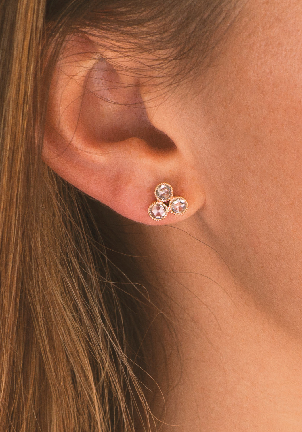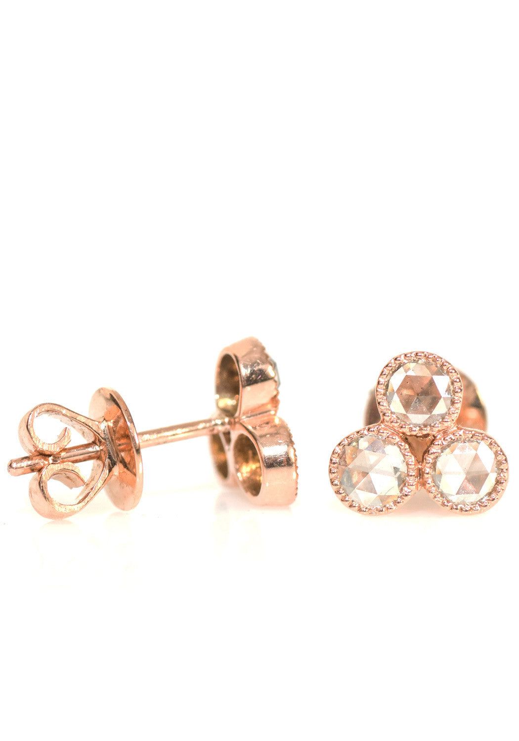 A contemporary twist on a classic, these Sethi Couture Grace stud sparklers feature a trio of rose cut diamonds with milgrain detailing cast in rose gold. A fabulous look for any occasion, these diamond stud earrings complement any outfit and can be paired with a 2nd or 3rd piercing for a unique personalized look.