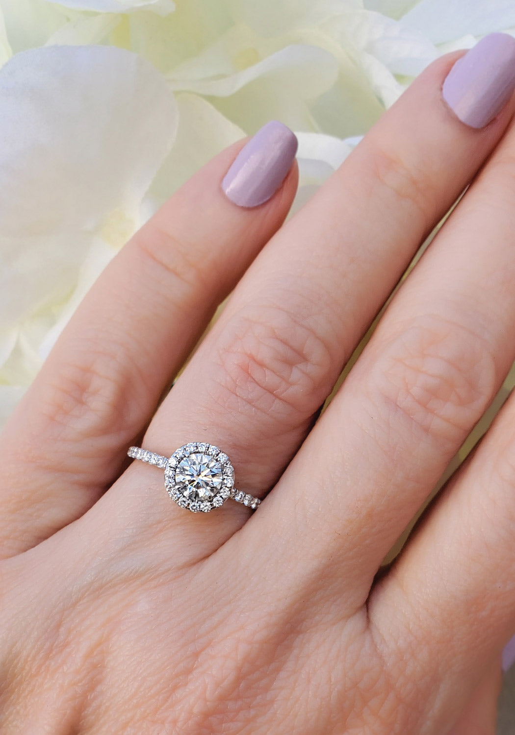 Behold the radiance of our 18K White Gold Round Diamond Ring, a beacon of unparalleled brilliance and sophistication. Centered by a captivating .71 ctw round diamond, this ring is exudes beautiful sparkle and light. A pavé diamond halo and band amplifies this ring's sparkle and allure. Each carefully selected diamond is meticulously set, creating a celestial halo effect that enhances the center stone's natural beauty and scintillation. The sleek 18k white gold setting offers a perfect canvas, its lustrous finish reflecting the diamonds' fire and brilliance. This ring is a testament to timeless elegance, designed for those who seek to encapsulate moments of pure joy and celebration. Ideal for engagements, anniversaries, or as a hallmark of personal achievements, this piece is not just a ring but a symbol of love's eternal glow.