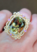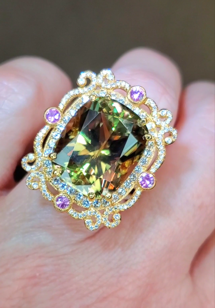An absolute show-stopper, this sensational one-of-a-kind cocktail ring by Erica Courtney features an impressive 19.19 carat rare zultanite stone accented with 18k rose gold and pavé diamond filigree flourishes. A transformative stone, the vibrant zultanite flashes between champagne and tangerine hues with sparks of meadow green as it catches the light. Four pretty in pink sapphire stones complement the alternating hues of the zultanite. This truly unique and incredible cocktail ring is a work of art for the fingers.