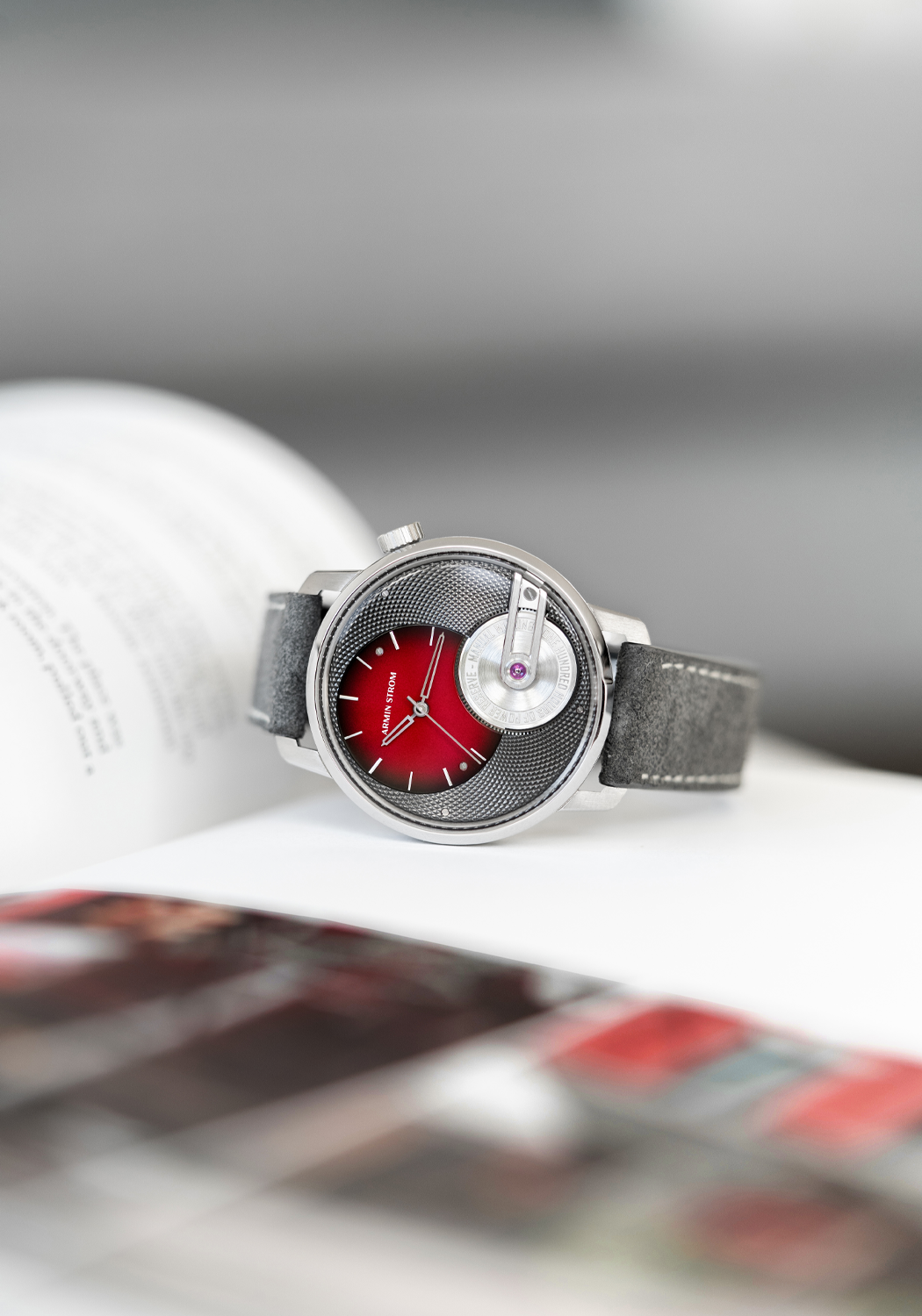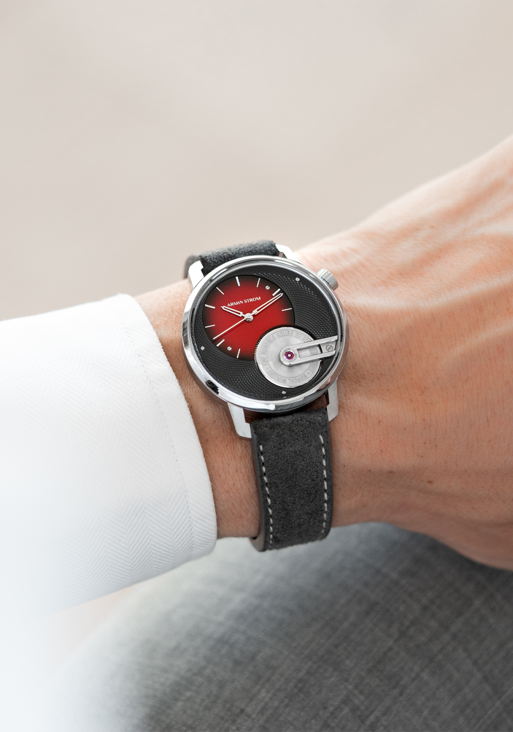 “The Tribute 1 is a twist on the classic dress watch – literally. From its slender 38 mm steel case with the crown unusually positioned at 2 o’clock, to the off-centered small dial displaying the hours, minutes and seconds, there’s harmony in its asymmetry. Like all Armin Strom creations, there’s something mechanical and quite ingenious to be admired from the dial side.” - Claude Greisler