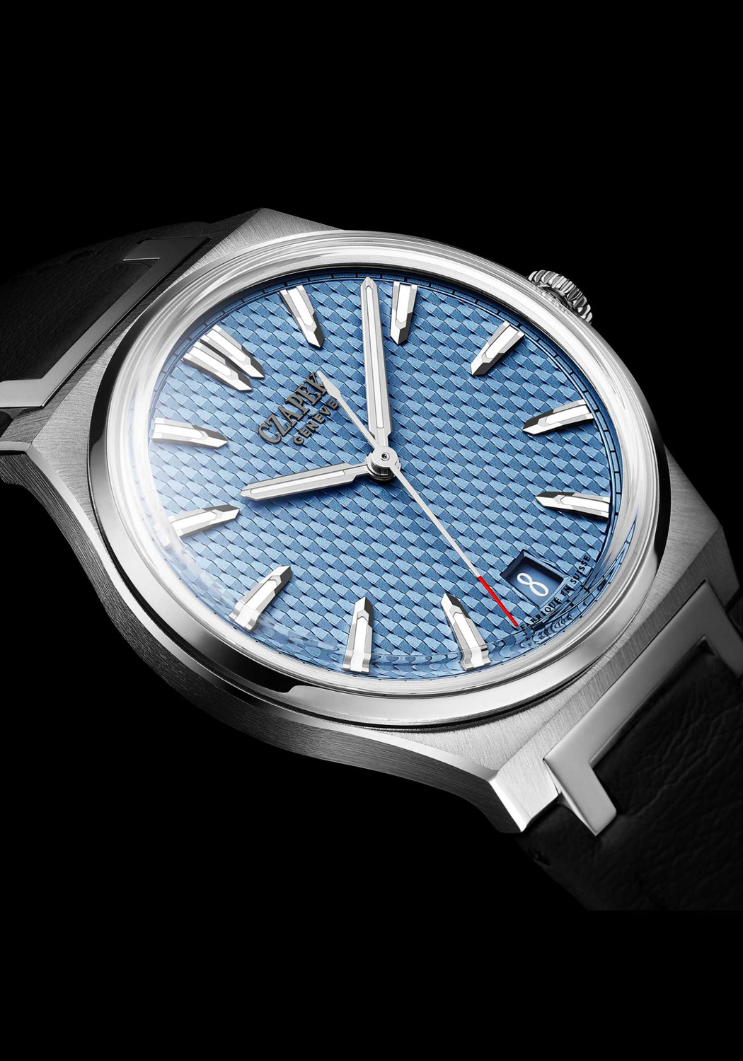 Two years following the successful launch of the Antarctique line, Czapek has returned with a refined smaller 38.5 mm version that's a perfect fit for smaller wrists. The entire case had to be redesigned while retaining the same characteristics that have made the Passage de Drake a glowing success. Czapek's attention to detail has triumphed again resulting in a visually balanced masterpiece, available here in Glacier Blue with Arabic "12" numerals and a red-tipped seconds hand.