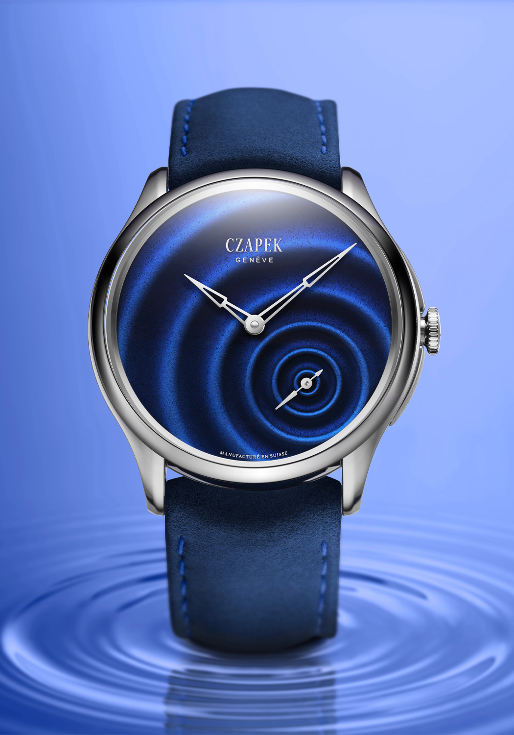 - Grand feu enamel dial creating an optical illusion of water ripples radiating out from the second's sub-dial