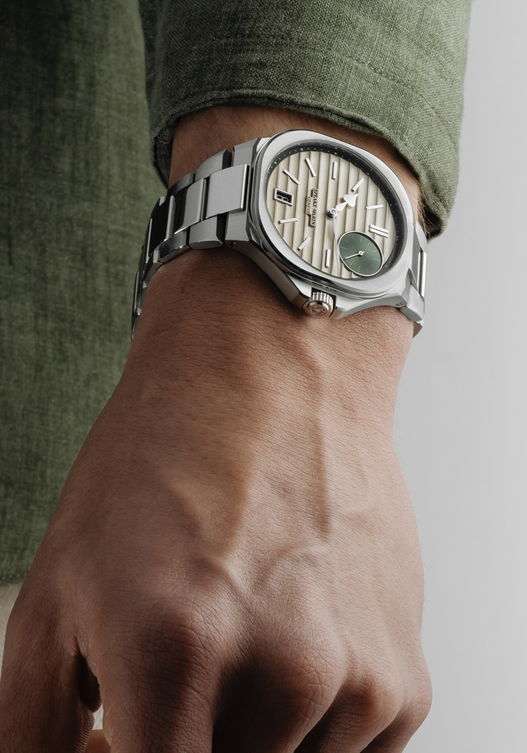 - Green small seconds counter at 1h30 with sunray finish, glossy white seconds markers, polished rhodium-plated steel hand, and rhodium-plated counter ring.