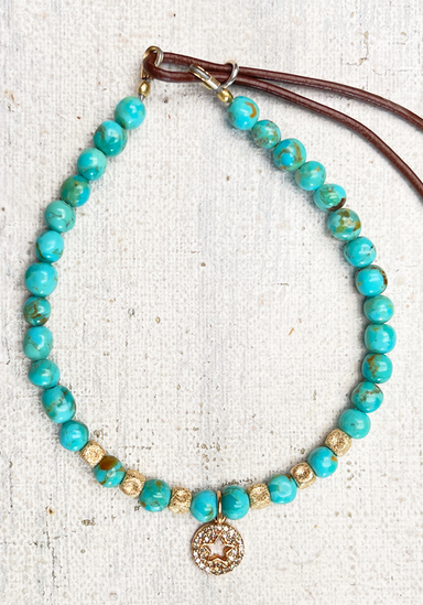Radiant turquoise and luxurious yellow gold gleam against rich brown suede in this exceptional choker by Lika Behar. The 3 mm Sleeping Beauty turqu...