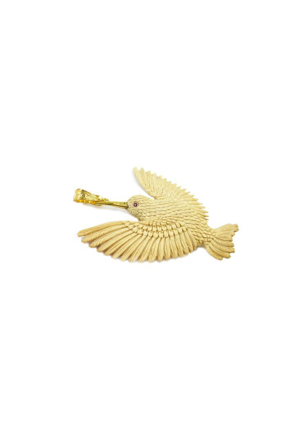A universal symbol of joy, the energetic hummingbird is forever preserved in intricately hand carved fossilized mammoth tusk on this spectacular necklace enhancer. Look closely to catch the sparkle of this magical creature's eyes, bestowed by two captivating rubies. This enhancer secures to the necklace of your choice with an 18k yellow gold hinged bail. This is a rare jewelry piece with beautiful craftsmanship, perfect for everyday wear. Chain is not included.