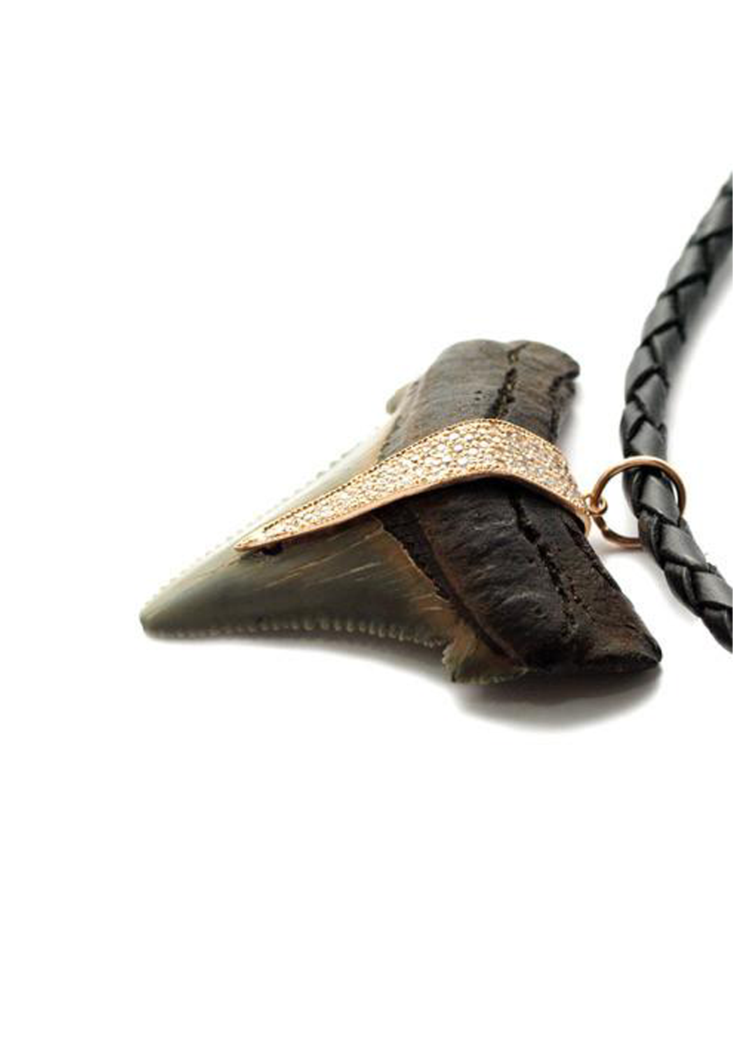 Sharks lose thousands of teeth over their lifetimes, which often become cherished beach finds. Fossilized shark teeth, typically darkened by sediment, are preserved from the effects of oxygen and bacteria. This exquisite piece comes on a leather cord but can also be styled with a gold chain for a versatile and refined look.