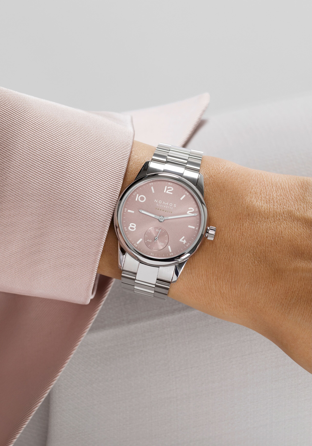 Compact yet powerful, the Club Sport neomatik 34 rosé is a striking addition to the NOMOS collection—combining high performance with an elegant, feminine touch. This versatile sports watch flatters any skin tone with its subtle rosé dial and sunburst finish, adding an extra layer of sophistication. Engineered for durability yet perfectly sized for smaller wrists, it’s as robust as it is refined, bringing an irresistible balance of style and strength to your collection.