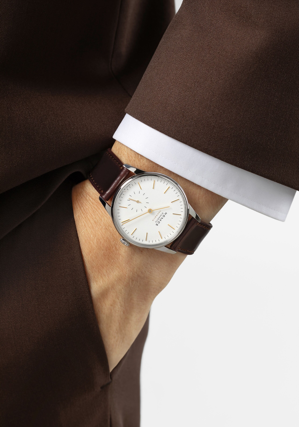 The Orion Neomatik Doré exudes refined elegance with its delicate golden thread hands gliding across a white silver-plated dial, complete with a gold-accented sub-seconds dial and a subtle golden dot at 6 o'clock. Its softly rounded case, domed sapphire crystal, and conical lugs create a perfectly harmonious design, while the polished bezel and crown add to its seamless beauty. Every detail of this timepiece flatters the wrist, offering a timeless blend of sophistication and modern luxury.
