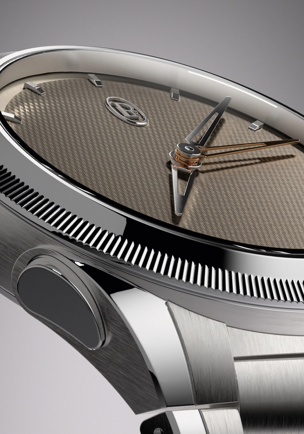 Polished & satin-finished stainless steel with platinum 950 knurled bezel