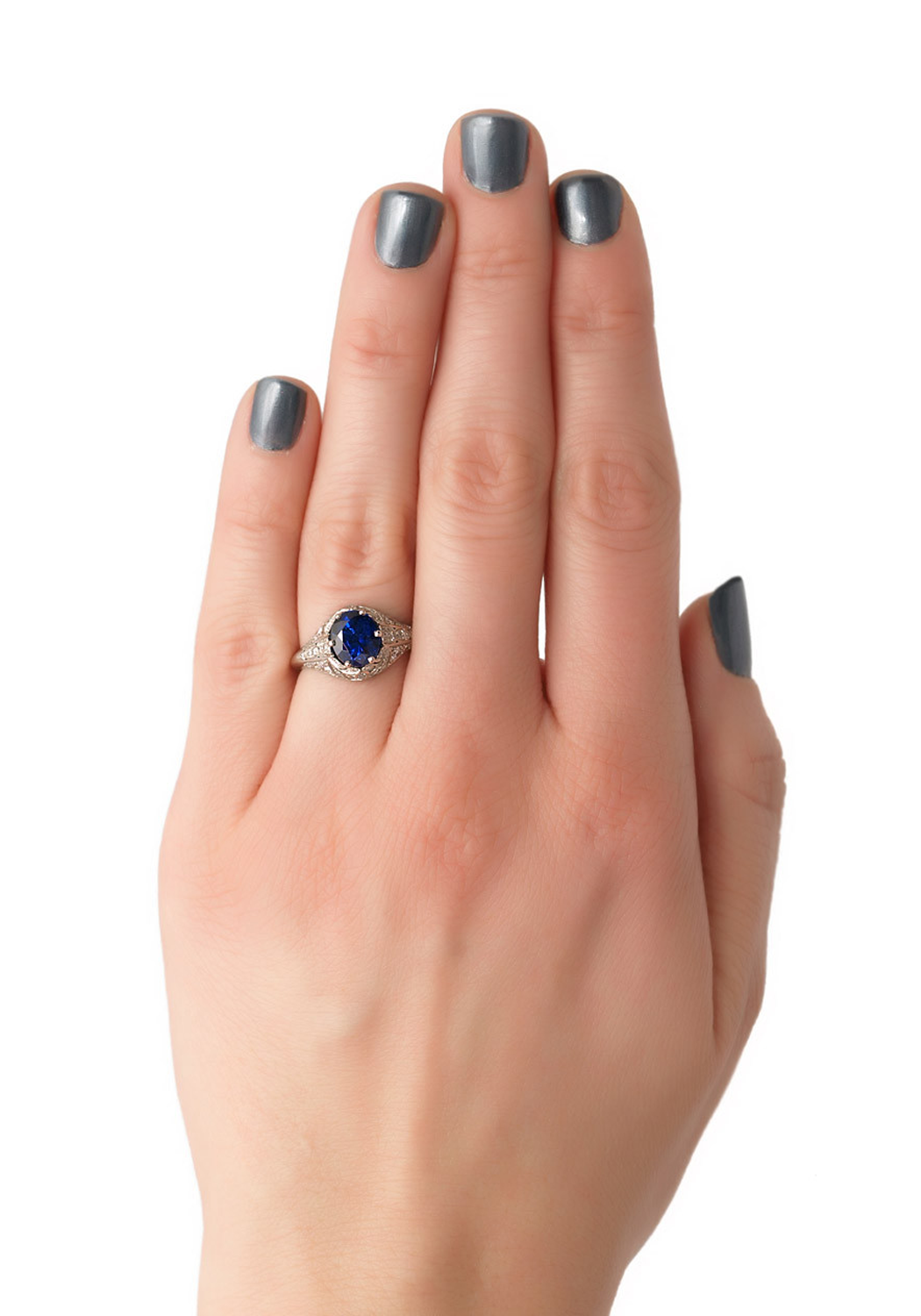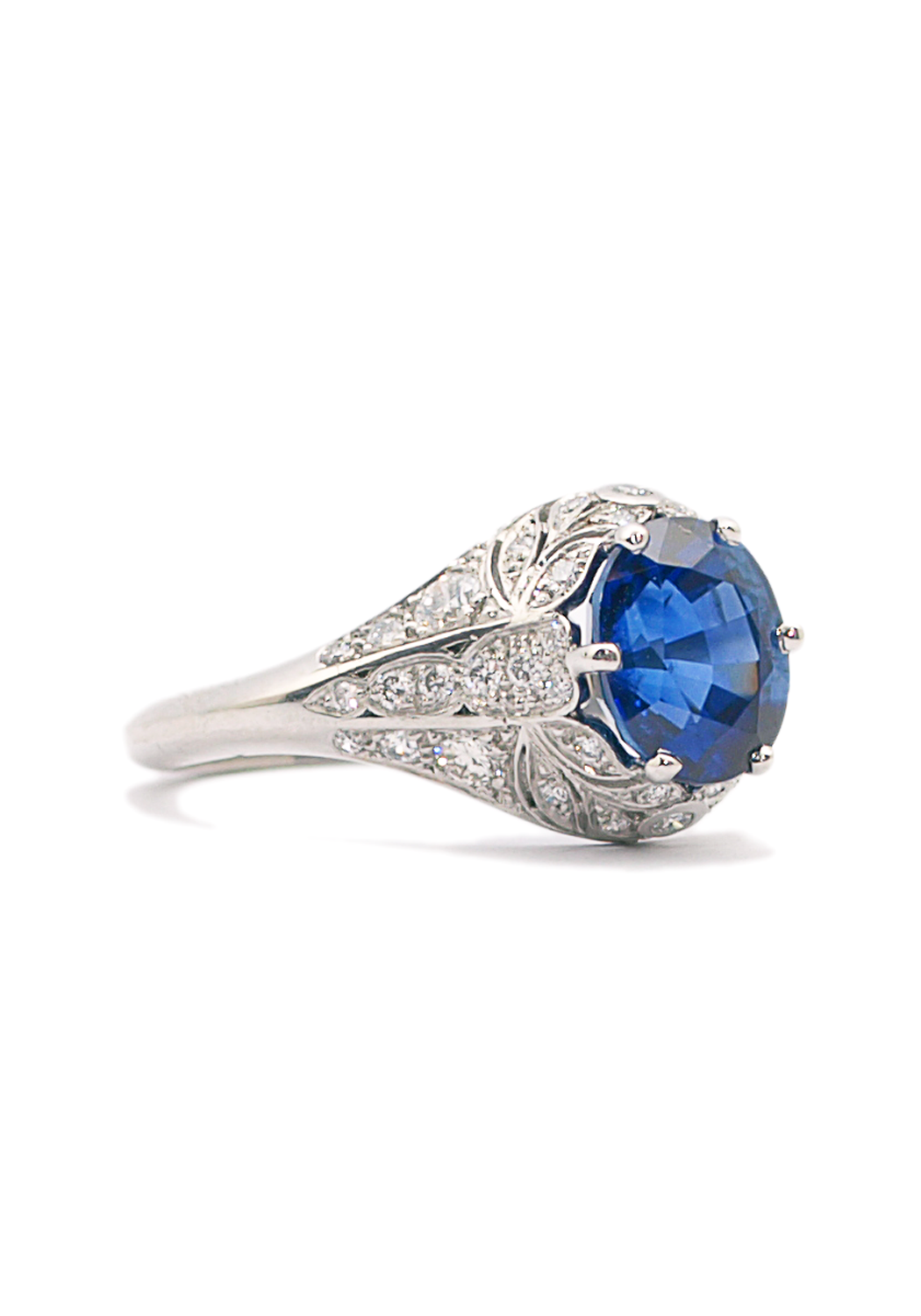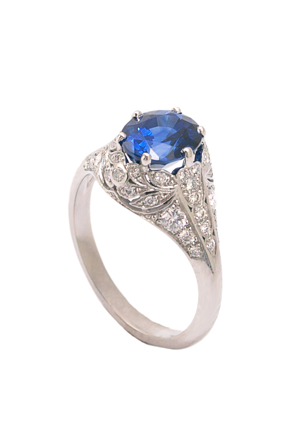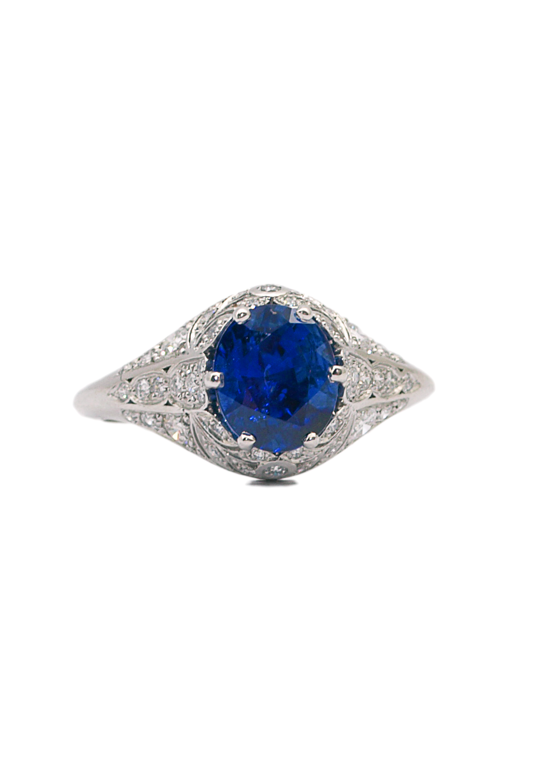 Sébastien Barier Platinum Diamond & Oval Sapphire Ring embodies vintage elegance and superior craftsmanship. Made in Paris with the utmost integrity, this stunning platinum engagement ring features a captivating 2.30-carat oval sapphire as its centerpiece. Surrounding the exquisite sapphire are .58 carats total weight of brilliant diamonds, meticulously set to enhance the overall allure of the ring. Each detail reflects Sébastien Barier's commitment to excellence and timeless design. Perfect for those who appreciate classic sophistication, this sapphire and diamond ring is a true testament to the artistry and heritage of Parisian jewelry making. Celebrate your love with a piece that exudes both luxury and elegance.