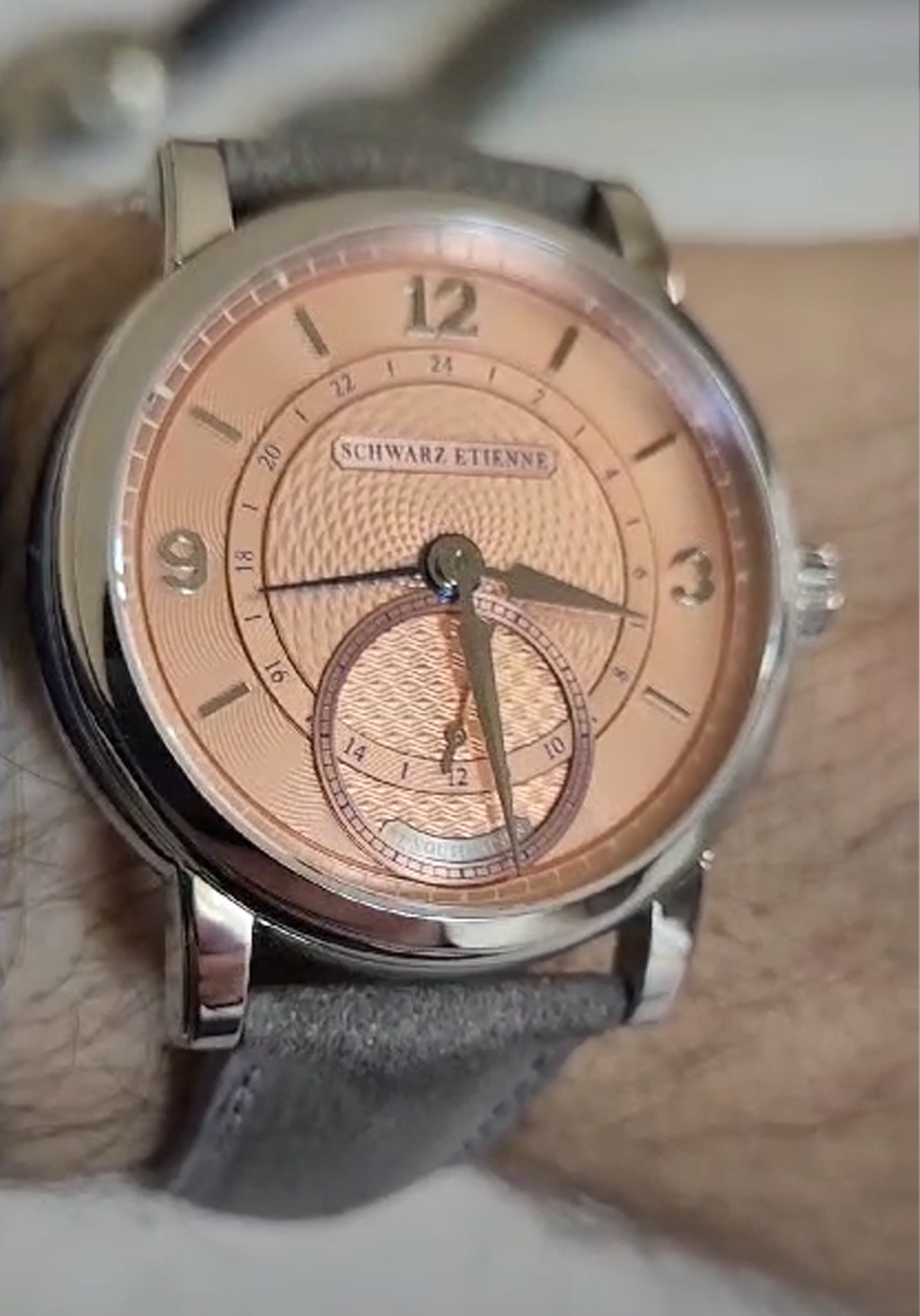The Schwarz Etienne Roma Geometry Salmon stands as a testament to intricate craftsmanship and elegant design. Its dial, segmented into quadrants, f...