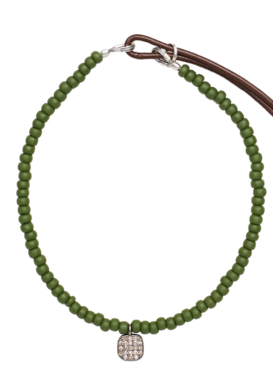 Reminiscent of fresh cut grass and the first leaves of Spring, this viridescent bracelet brings lively olive green Japanese seed beads to the wrist for a fun pop of color. Accented with a pave diamond square silver charm for brilliant sparkle. An adjustable leather tie with stainless steel fastenings and two silver cubes ensure the perfect fit. Create a unique stack of your own my mix and matching Catherine Michiels bracelets for a dynamic layered look.