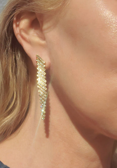 The Ruchi Scintillate Slanted Baguette & Round Diamond Chandelier Earrings dazzle with sophistication. Crafted in 18k yellow gold, ten rows of ...