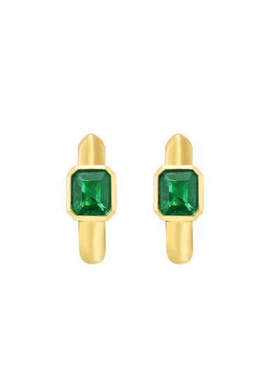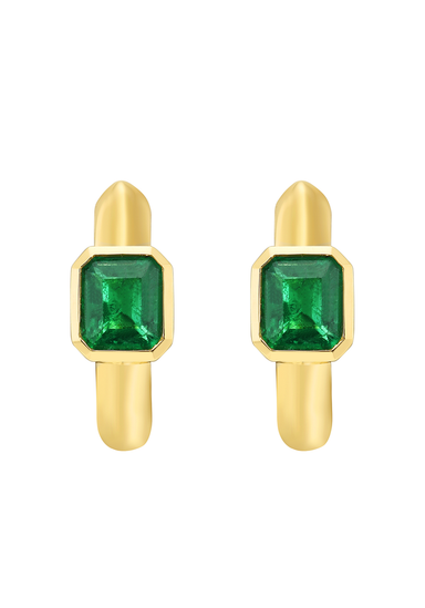 The Ruchi 18K Yellow Gold Jardin Solitaire Emerald Hoop Earrings bring together vibrant elegance and refined design. Adorned with .78 carats of rad...