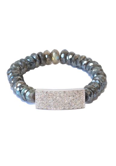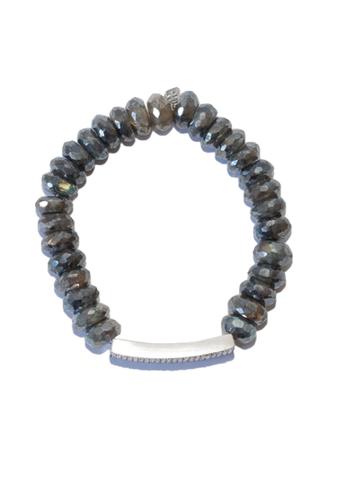 A captivating marquise eye charm with a solitaire diamond gracefully adorns a bracelet of polished 7mm rondelle rainbow white moonstone...