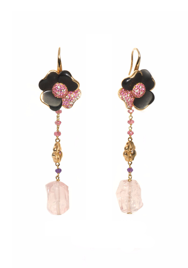 Valente Jet Pink Sapphire Rose Quartz Flower Dangle Earrings
