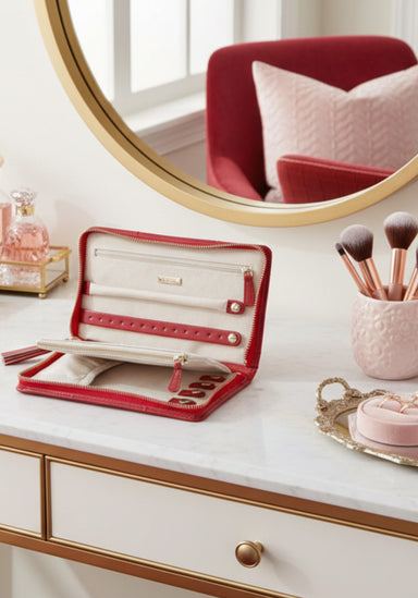 A timeless symbol of elegance, the Wolf Caroline Red Leather Jewelry Portfolio blends vintage-inspired sophistication with modern functionality. Cr...