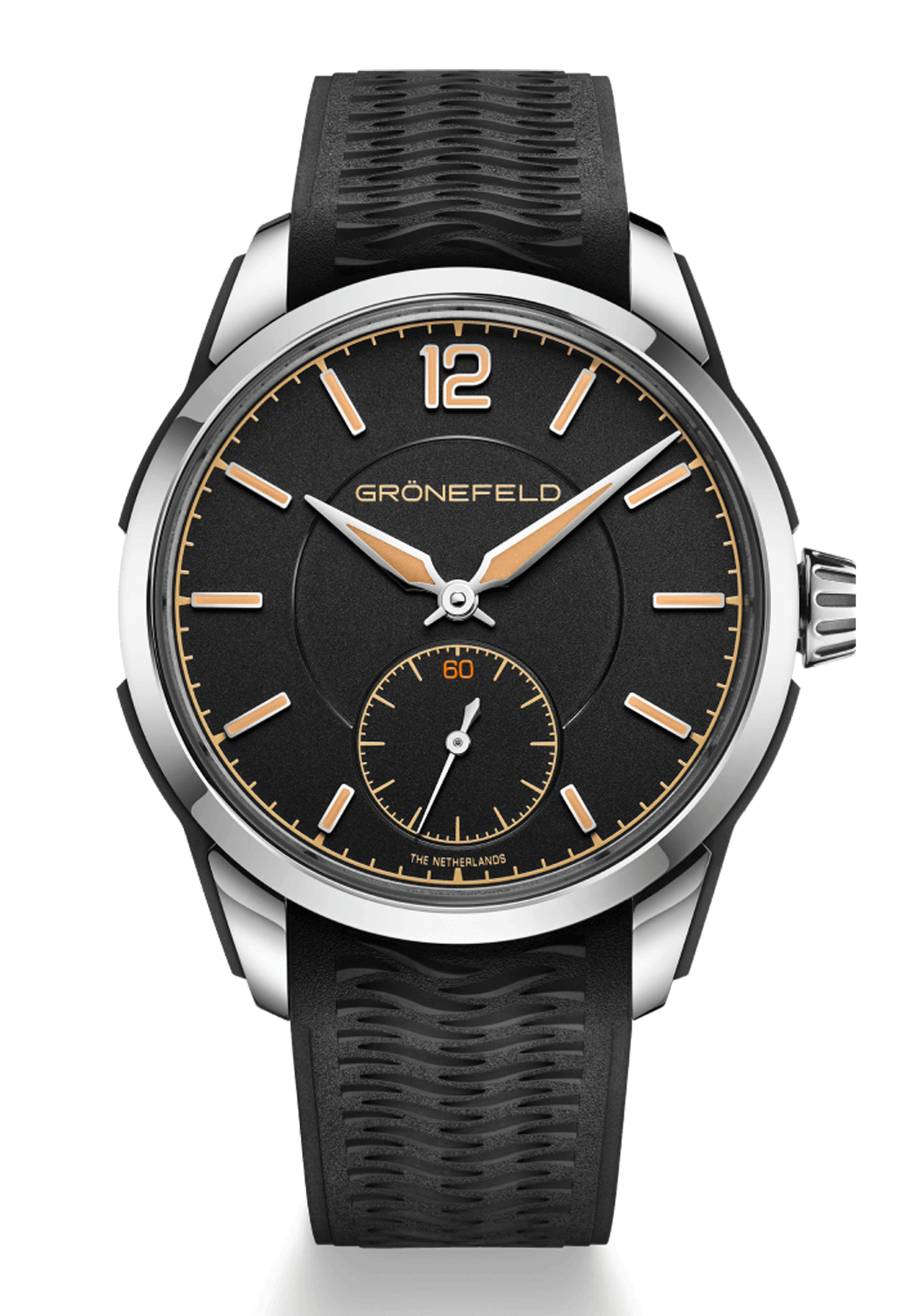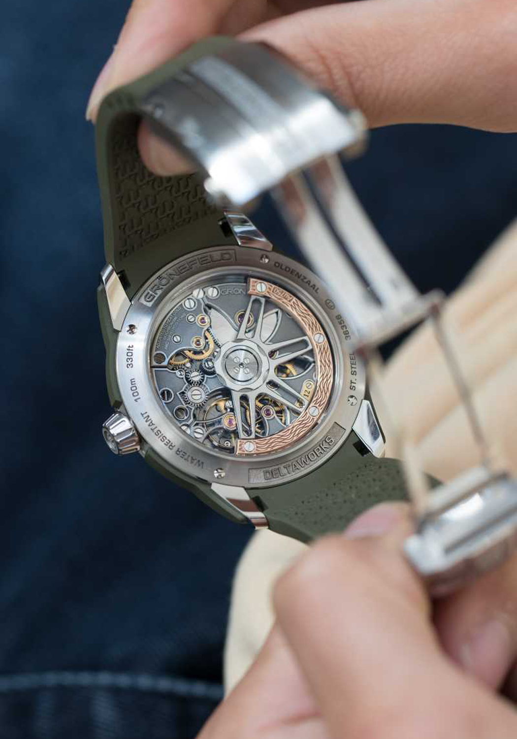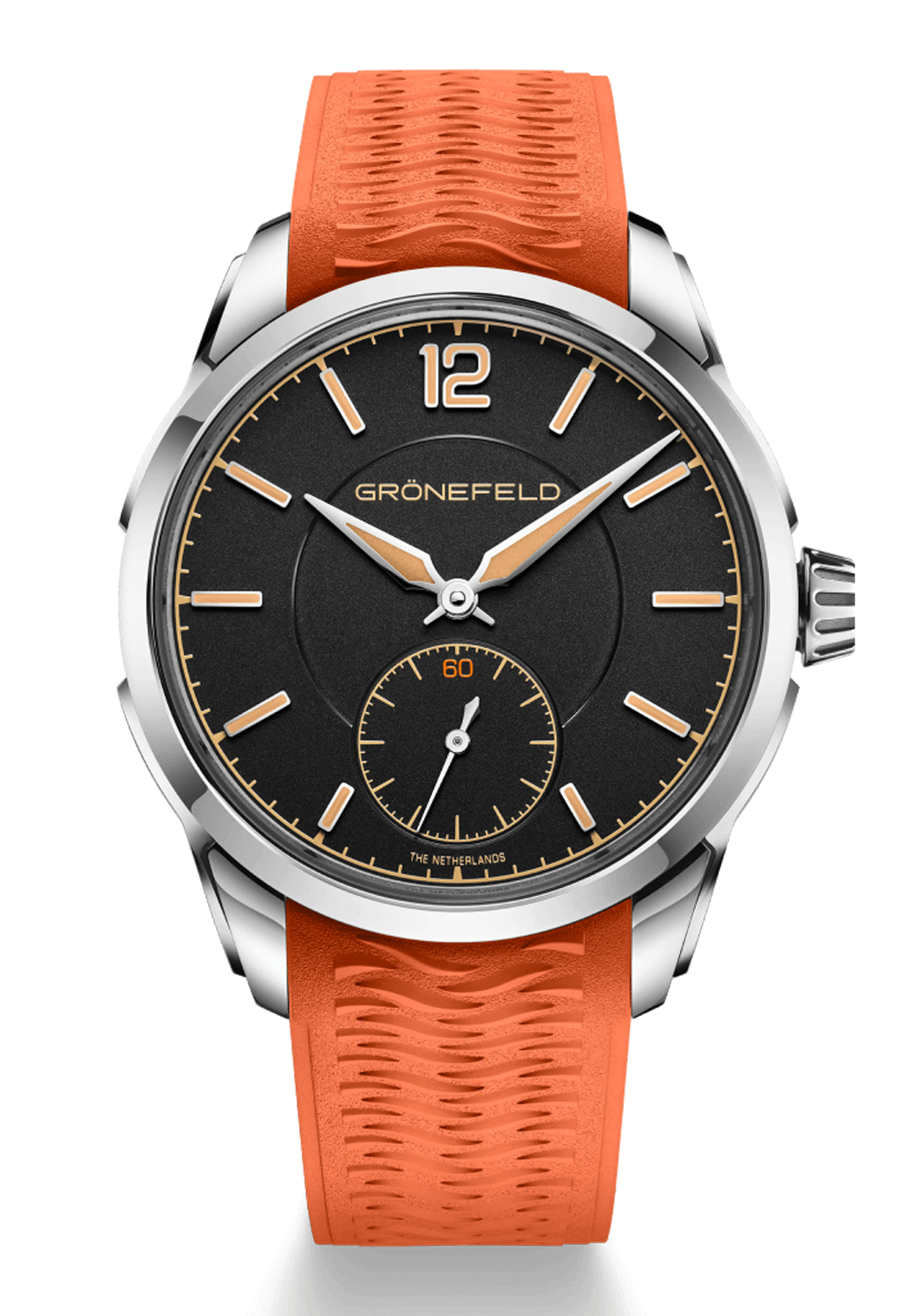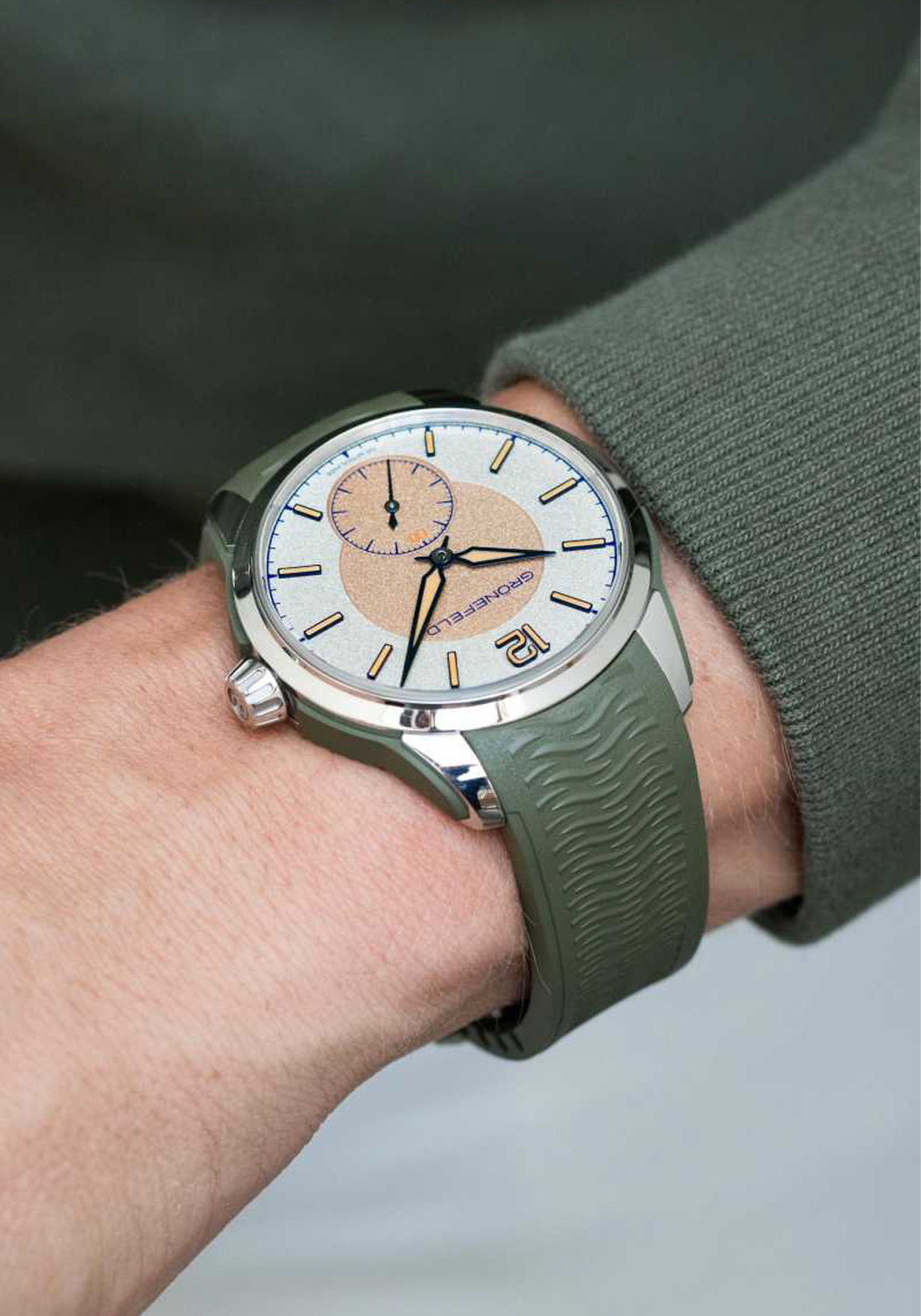 When designing this watch, Bart & Tim wanted to produce a model that indulged purists with a remarkable choice of colors and styles. The 1969 DeltaWorks is available with three different dial designs/colors, 5 different strap options and finally, a choice of stainless steel inserts or color-coordinated FKM rubber-clad inserts. The model is designed to cope with the perils of water ingress and shocks while still upholding the elevated standards of horology and traditional craftsmanship that are synonymous with the Grönefeld name.
