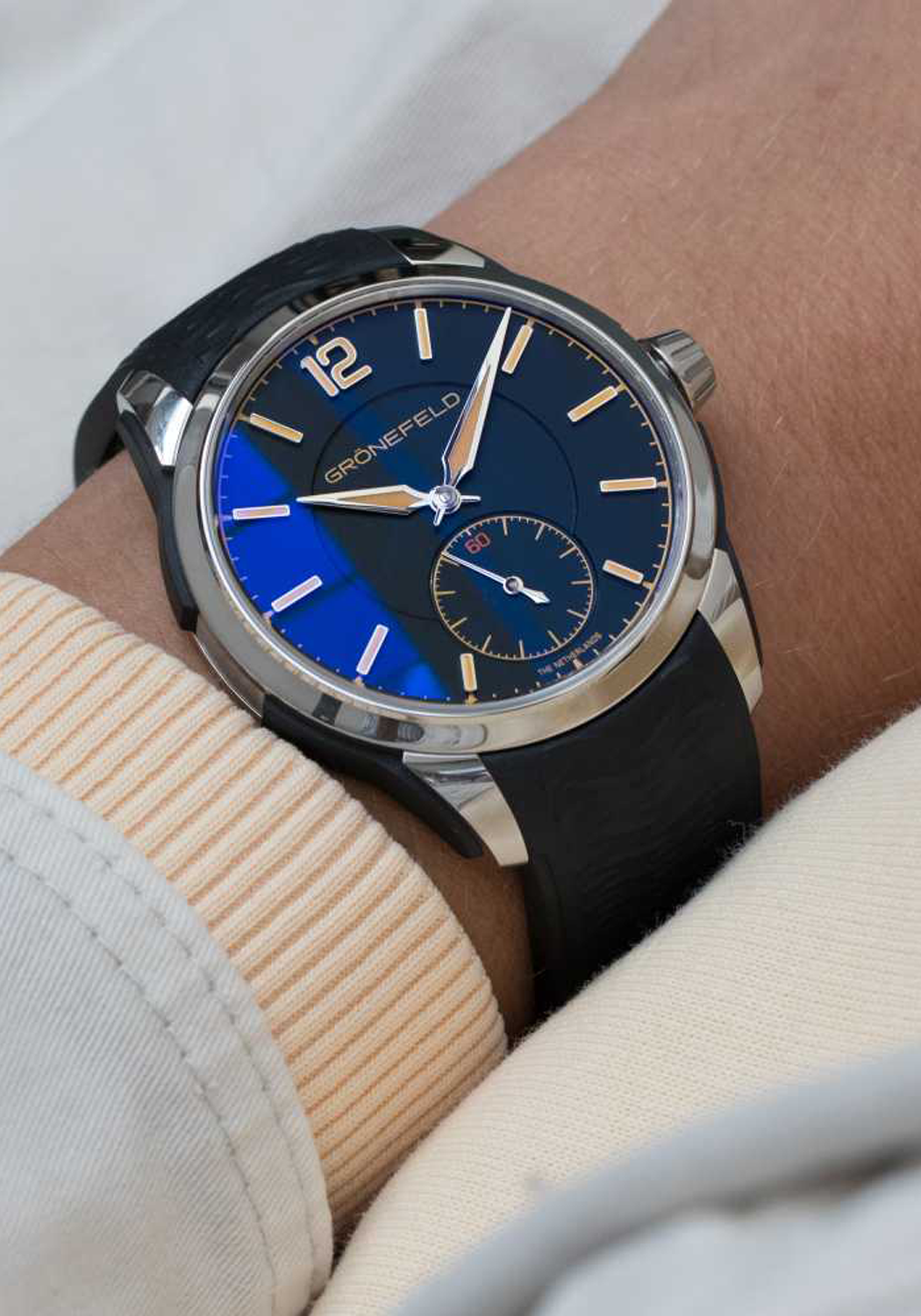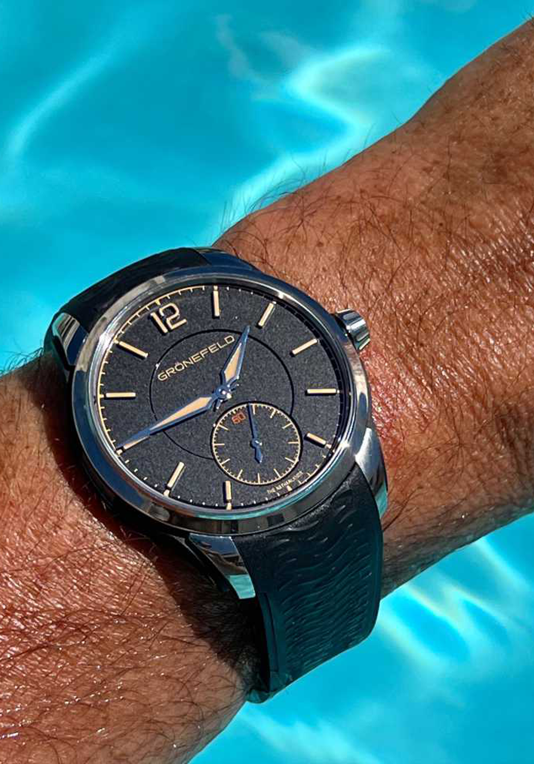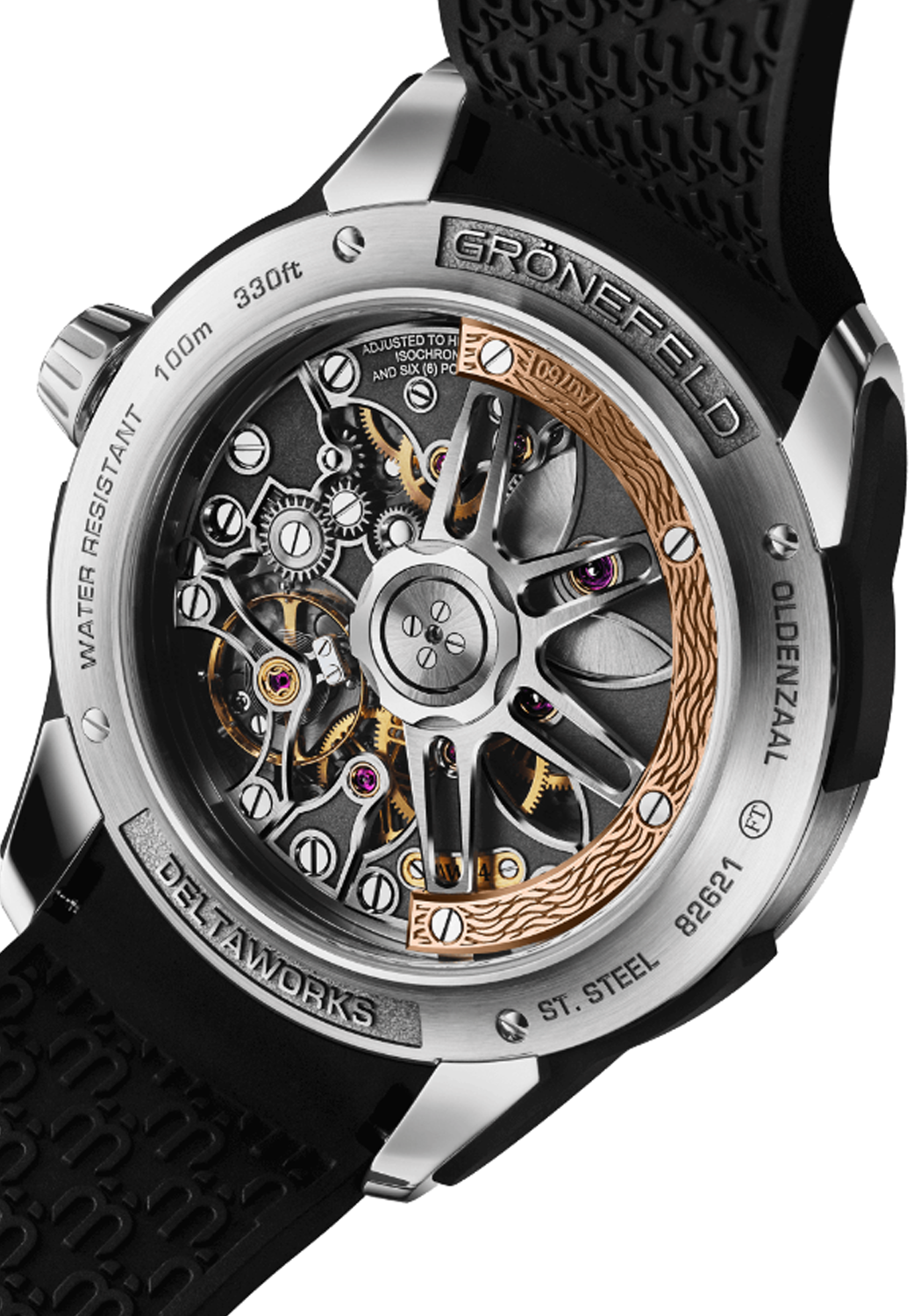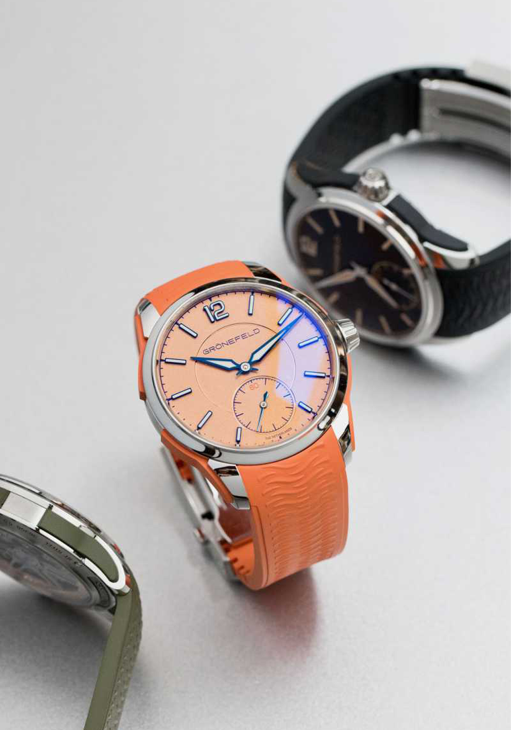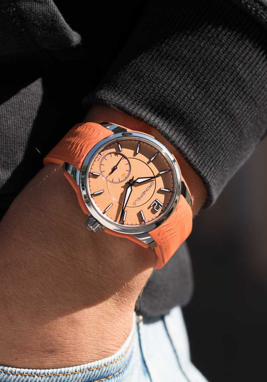 When designing this watch, Bart & Tim wanted to produce a model that indulged purists with a remarkable choice of colors and styles. The 1969 DeltaWorks is available with three different dial designs/colors, 5 different strap options and finally, a choice of stainless steel inserts or color-coordinated FKM rubber-clad inserts. The model is designed to cope with the perils of water ingress and shocks while still upholding the elevated standards of horology and traditional craftsmanship that are synonymous with the Grönefeld name.