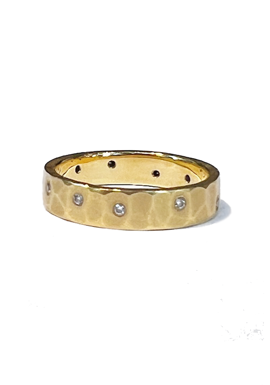 Bold, textured, and timeless—this hammered 18k yellow gold band with scattered diamonds brings a touch of organic elegance to any look. The artful placement of sparkling diamonds across the hammered surface creates a beautiful contrast that catches the light with every movement. Whether worn as a modern wedding band or a statement fashion ring, this piece is perfect for those who appreciate unique, understated luxury. It's a symbol of love, individuality, and refined taste, all in one.