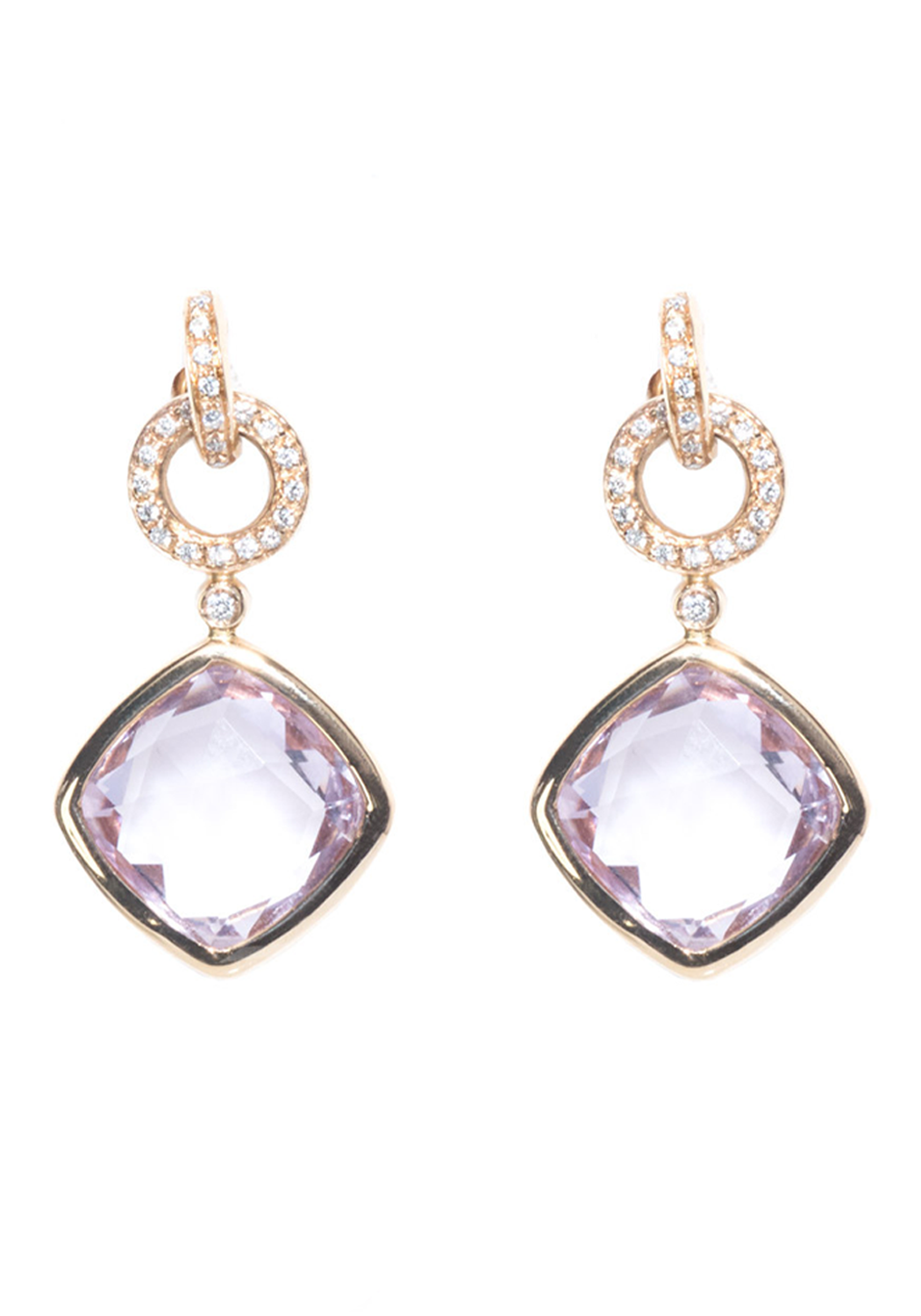 Captivating Rose de France is the star of the show on these spectacular Jicky amethyst dangle earrings by A & Furst. The soft lilac hues are complemented magnificently by the warmth of romantic 18k rose gold, whilst diamond accents bring added sparkle to the ears with every minute movement made. Handmade in Italy.