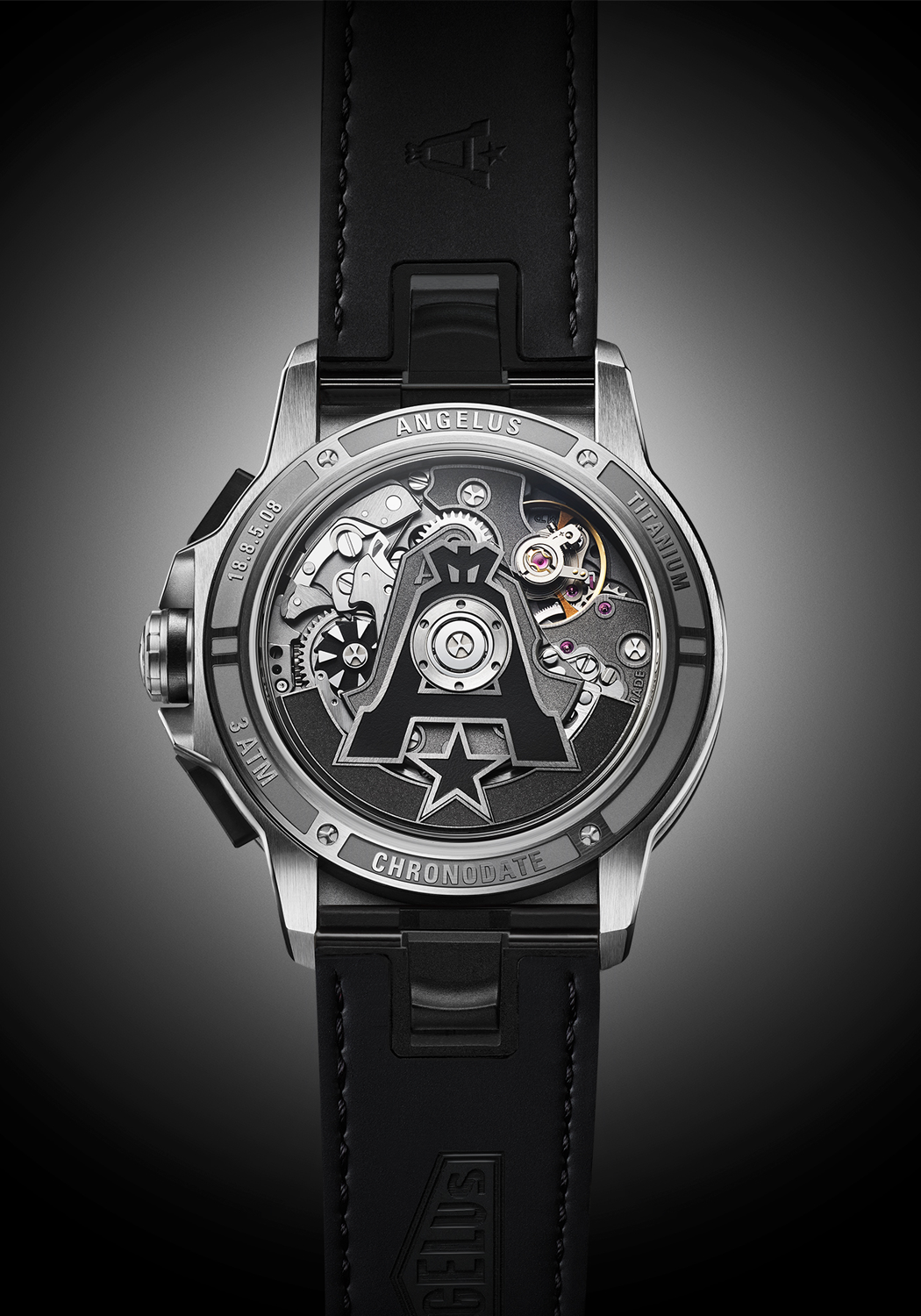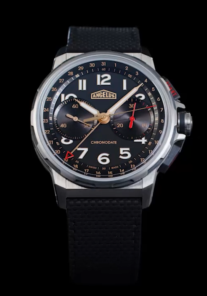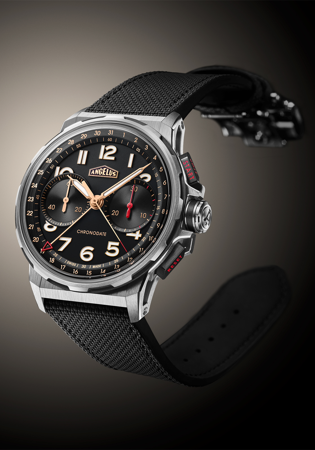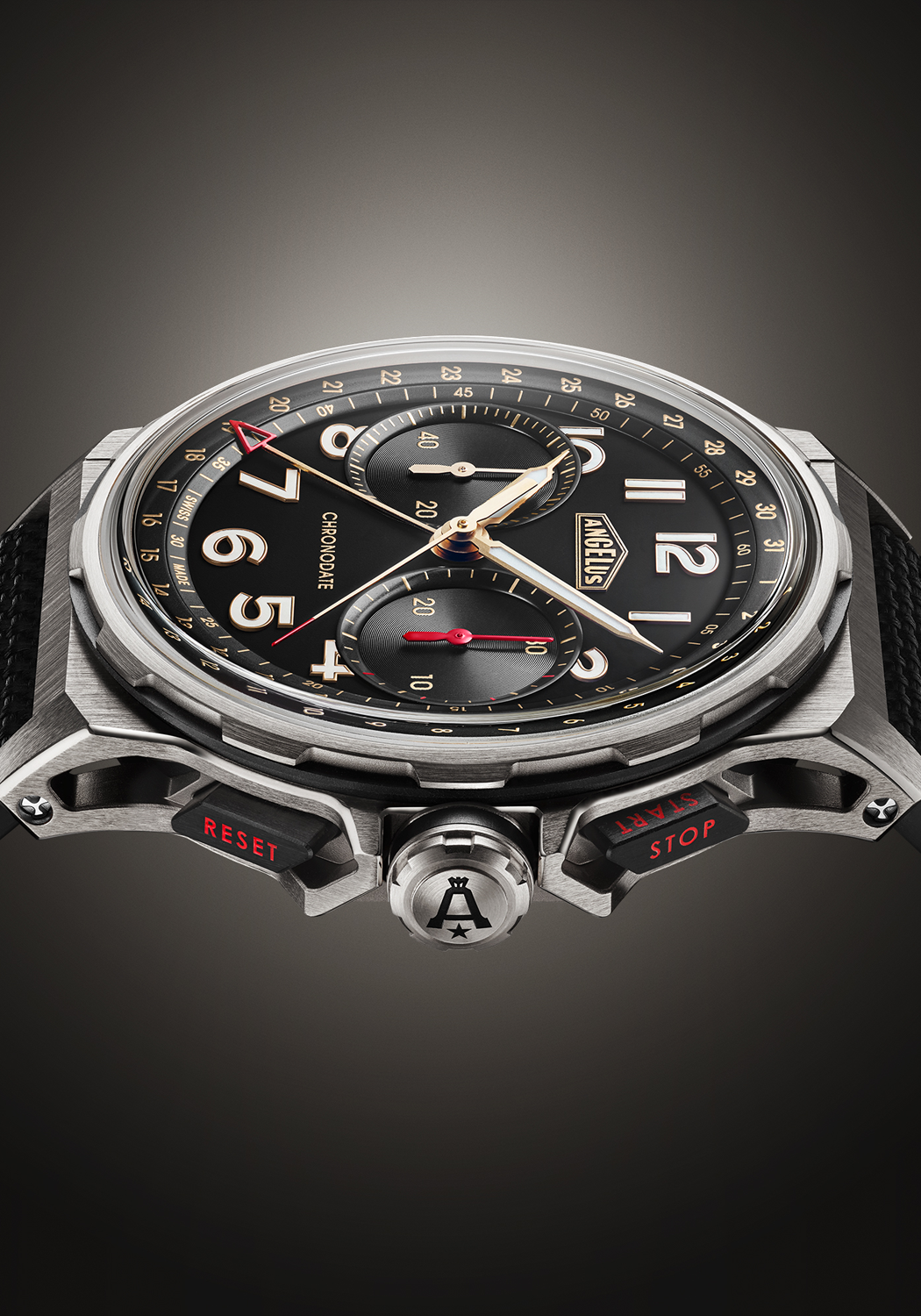 Fusing the aesthetics of Angelus past and present, the Chronodate Titanium brings forth a contemporary timepiece with a technically impressive design in a striking 42.5 mm titanium case. The Chronodate complication pays tribute to one of Angelus' earliest innovations which they helped pioneer, the double push-piece chronograph wristwatch. Here, it is translated with a modern interpretation fusing comfort and style with impressive function.