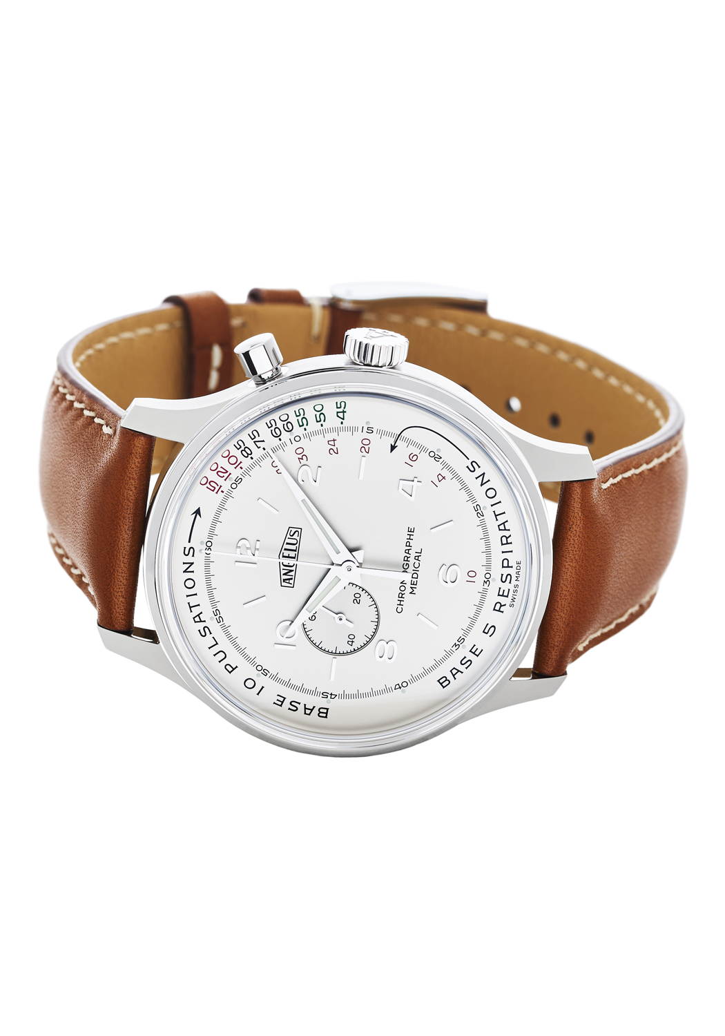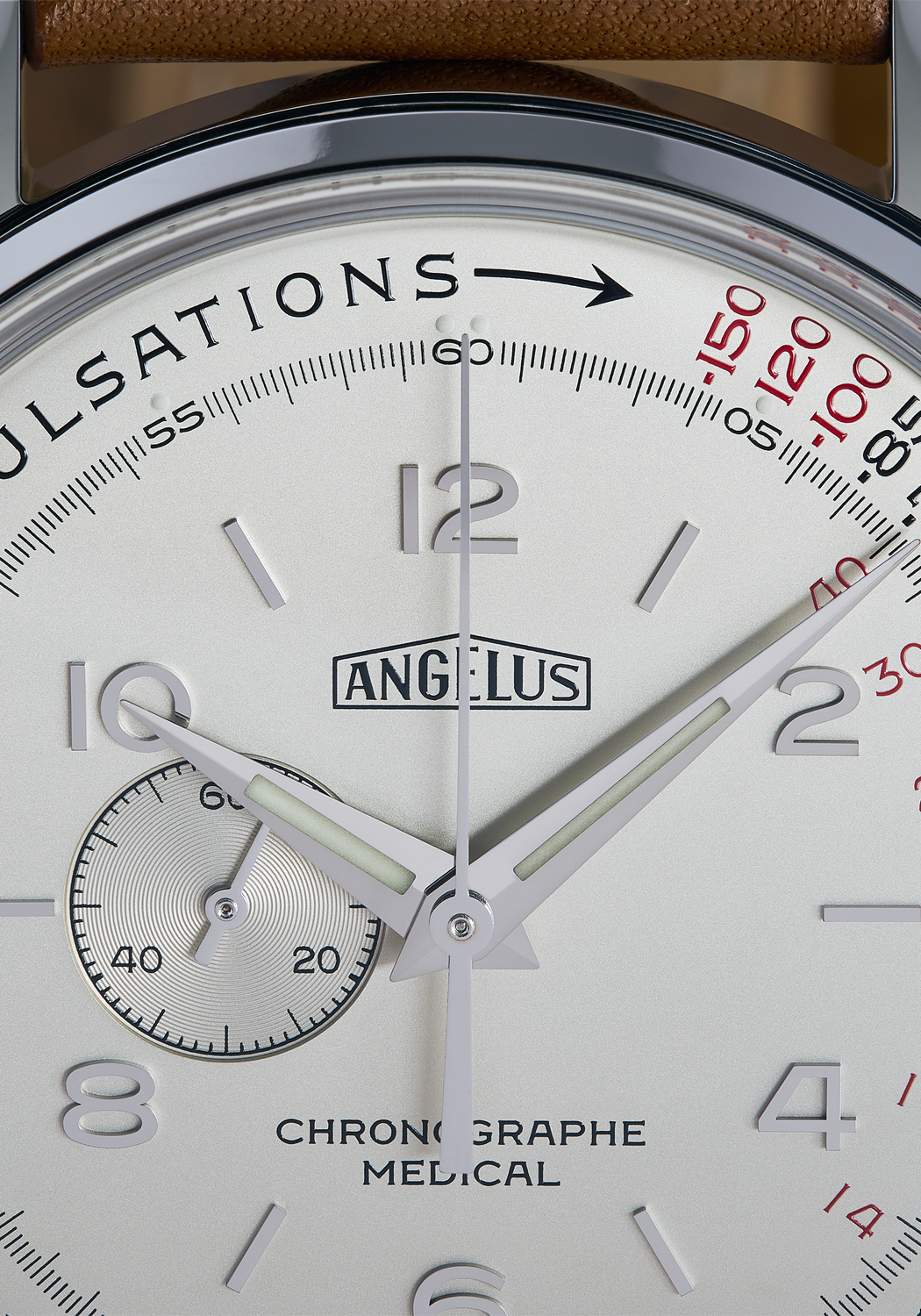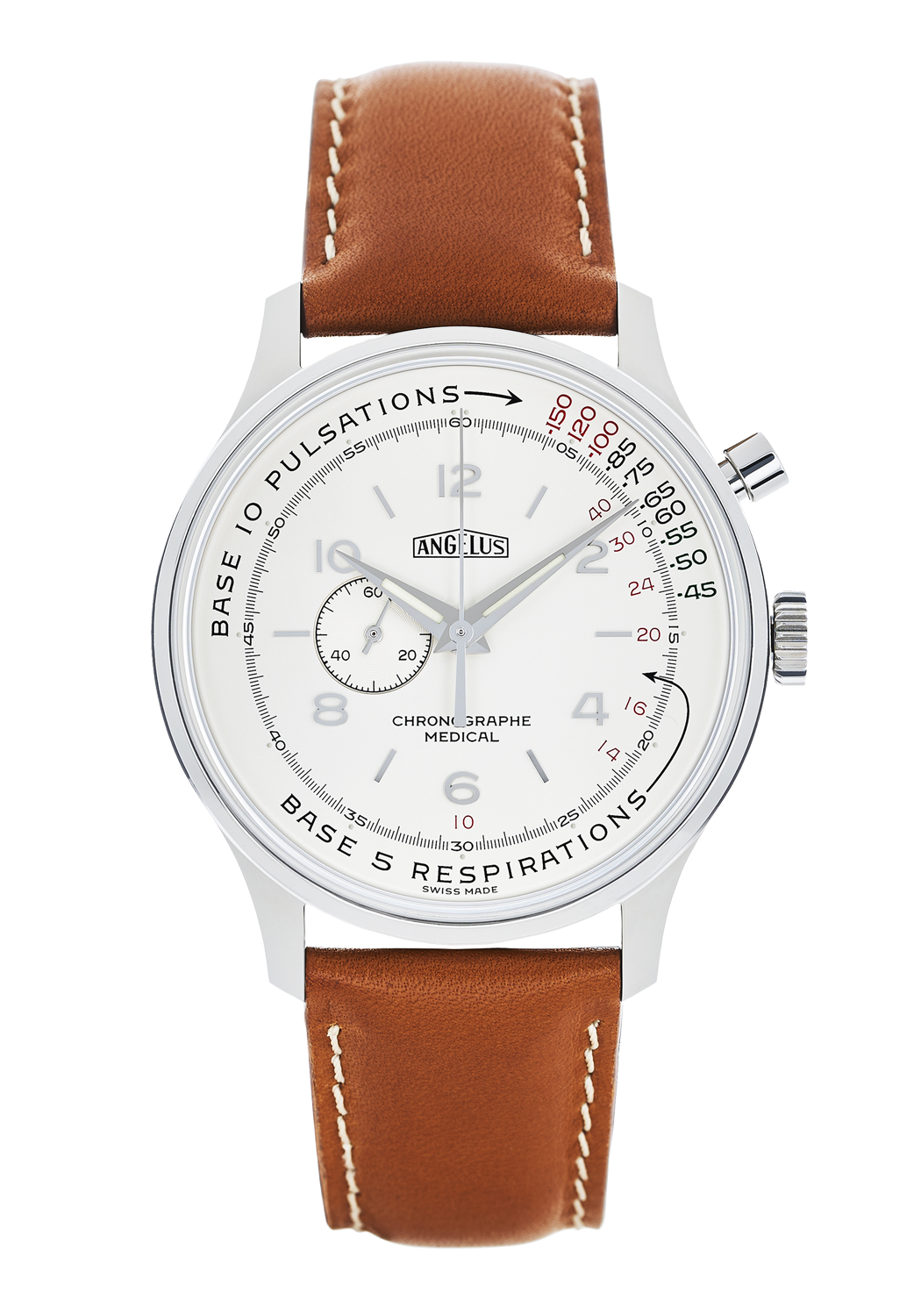 The finishing details of the Angelus Chronographe Médical x Massena LAB are really what makes this watch shine on the rest. More than just functional, it is an aesthetically pleasing timepiece housed within a surgical steel case. The silver opaline dial provides the perfect clean and neutral base for exact readings, while the golden Novonappa calfskin strap (one of the most luxurious of leathers) makes for an exceptionally comfortable fit on the wrist.
