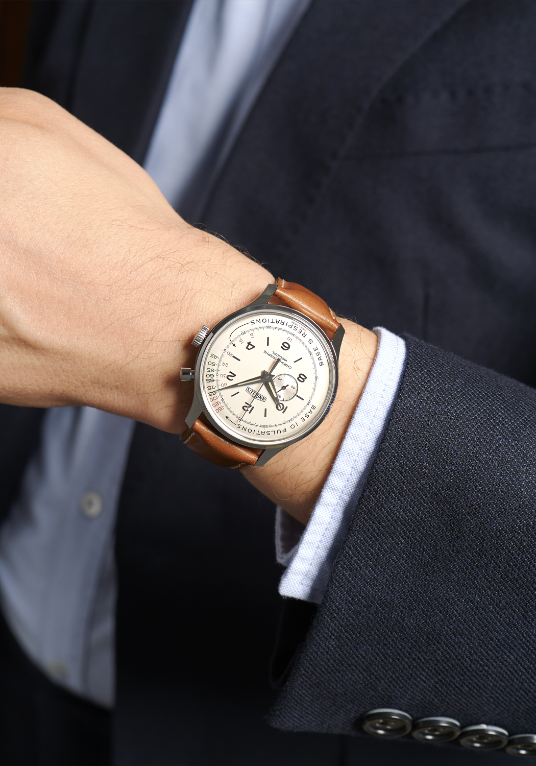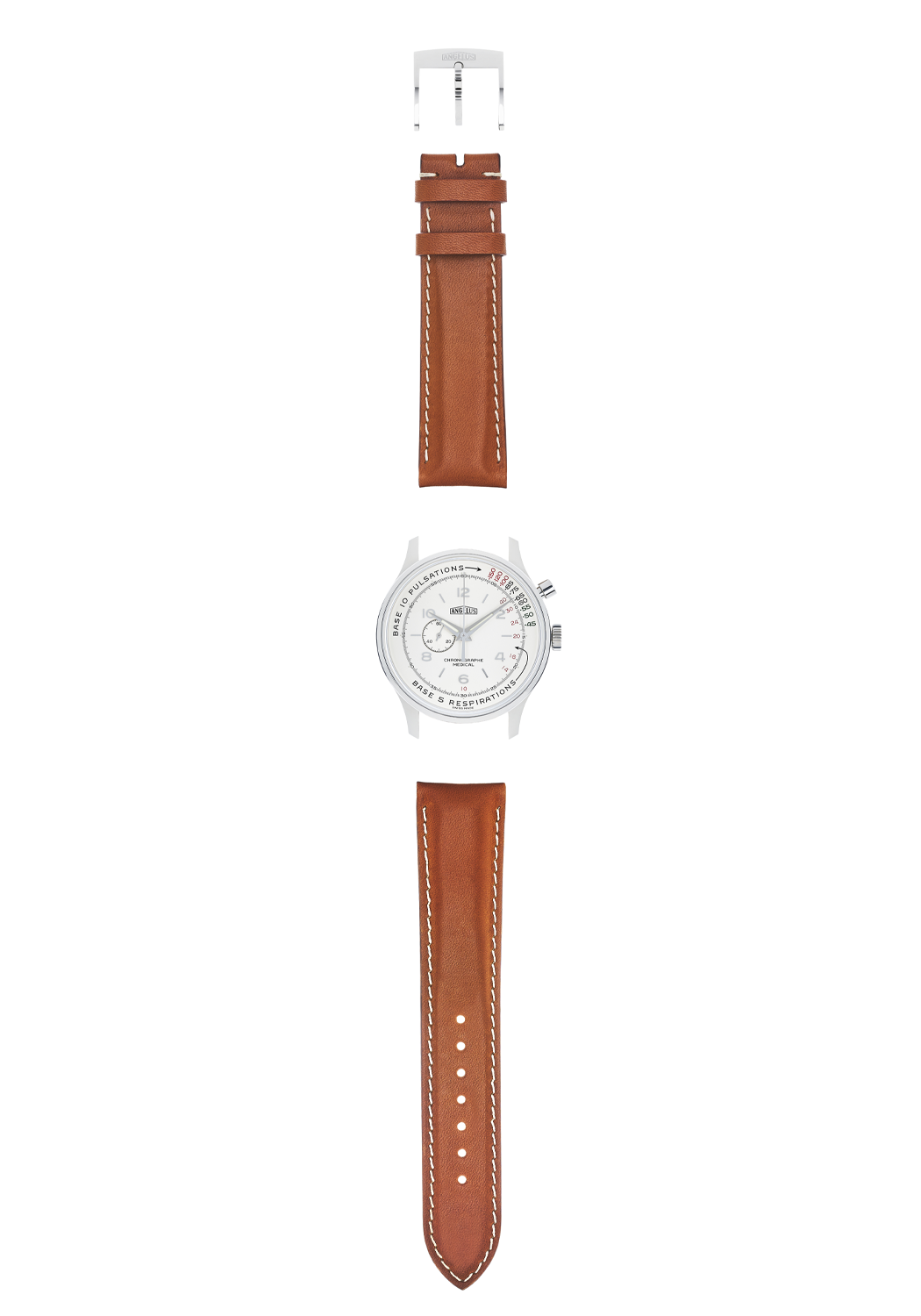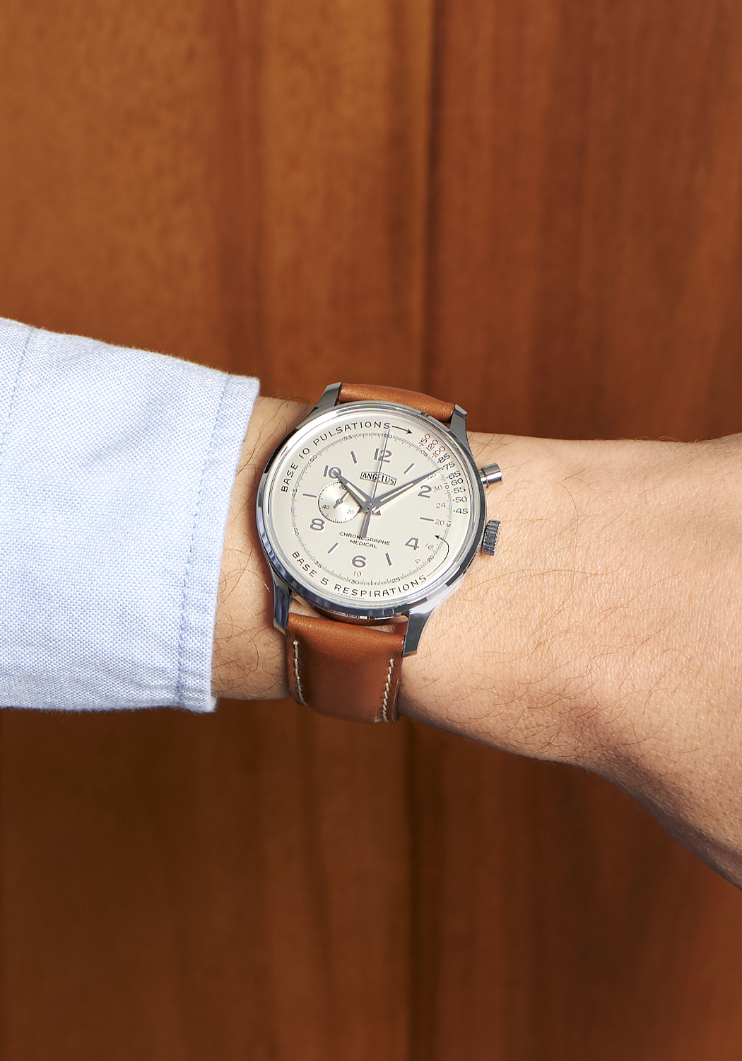 The finishing details of the Angelus Chronographe Médical x Massena LAB are really what makes this watch shine on the rest. More than just functional, it is an aesthetically pleasing timepiece housed within a surgical steel case. The silver opaline dial provides the perfect clean and neutral base for exact readings, while the golden Novonappa calfskin strap (one of the most luxurious of leathers) makes for an exceptionally comfortable fit on the wrist.