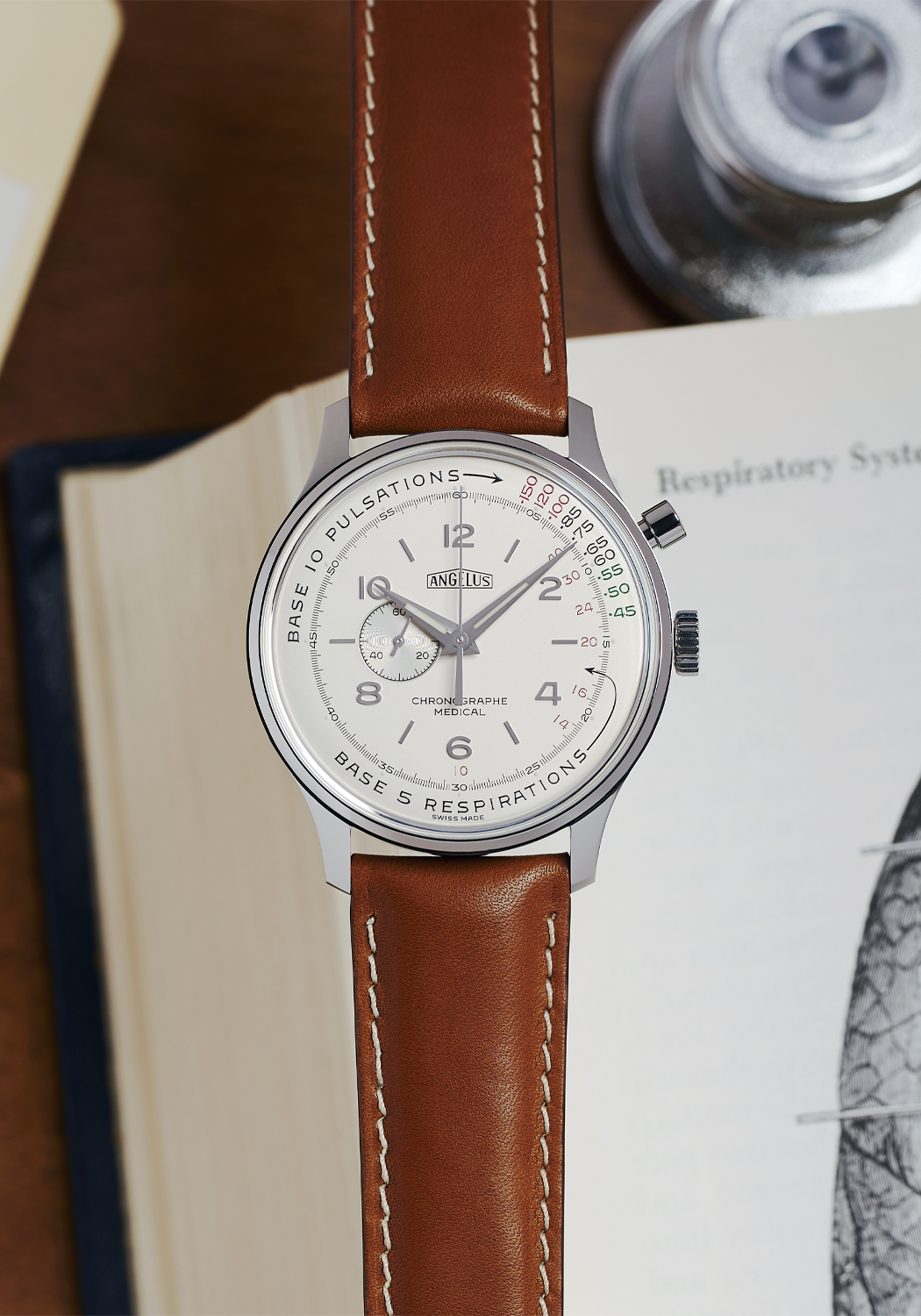 Paying tribute to its original 1960s "doctor's watch," the limited edition Angelus Chronographe Médical collaboration with Massena Lab is a true tool chronograph that fills a function beyond fine watchmaking. Every detail has been considered to make this watch the perfect companion for medical professionals. The beating heart of this timepiece, the A5000, features an integrated chronograph with a one-minute monopusher, a pulsometer, and an asthmometer. The pulsometer is color-coded in green, black, or red, denoting the severity of the reading. Nested inside of the minute circle, the respiratory scale is red to give contrast. At 39 mm, the Chronographe Médical is also larger than its predecessor, to allow for more visibility and greater legibility.