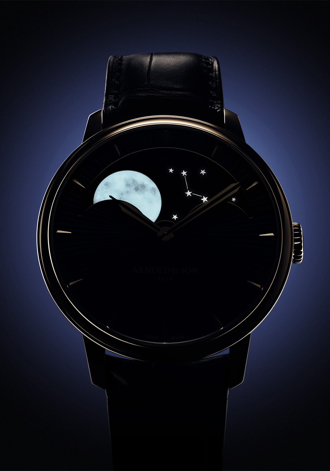 A celestial dream on the wrist, the Arnold & Son Perpetual Moon 41.5 Gold shows off an exquisite moon phase display accented by the unique Stellar Rays finish in blue. The rays are intentionally uneven in depth and width and finished with transparent lacquer, creating an interplay of light with every flick of the wrist.