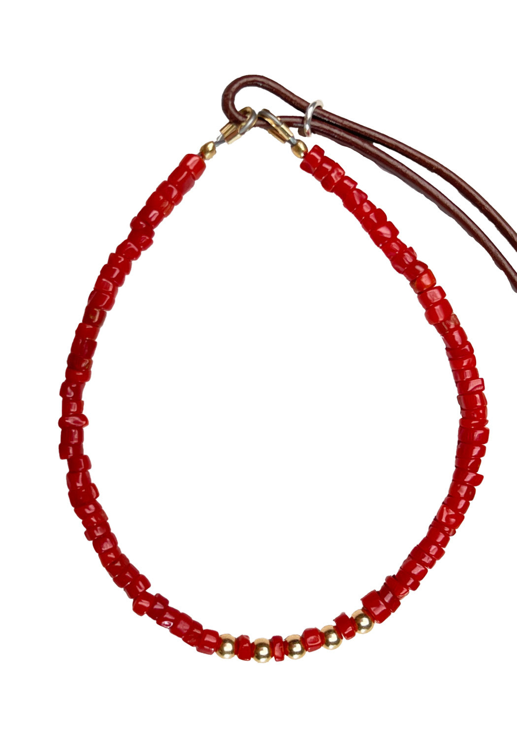 Vibrant red coral heishi beads evoke the spirit of the tropics on this dynamic Catherine Michiels Aida beaded bracelet that'll have you ready for your vacation. Five 14k yellow gold beads break up the coral beads while an adjustable leather tie with 14k yellow gold fastenings ensure the perfect fit. Wear this bracelet by itself or in a beaded bracelet stack with other charm bracelets.