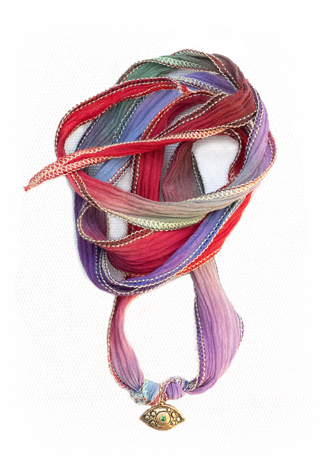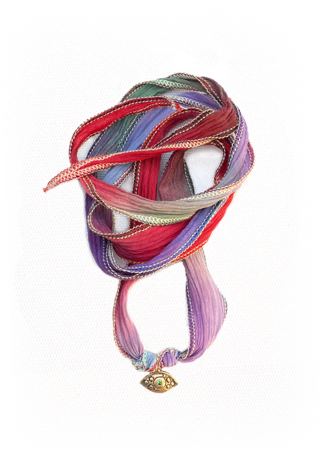 Open your third eye to wonder and awakening with the Catherine Michiels mini amazing eye charm, a protection and a good luck talisman to keep by your side with a tiny tsavorite stone at its center. The mystical charm is shown here in bronze strung on a muted rainbow 100% silk wrap that's perfect for wrapping around a wrist. Wear this wrap by itself or stacked with other charm bracelets.