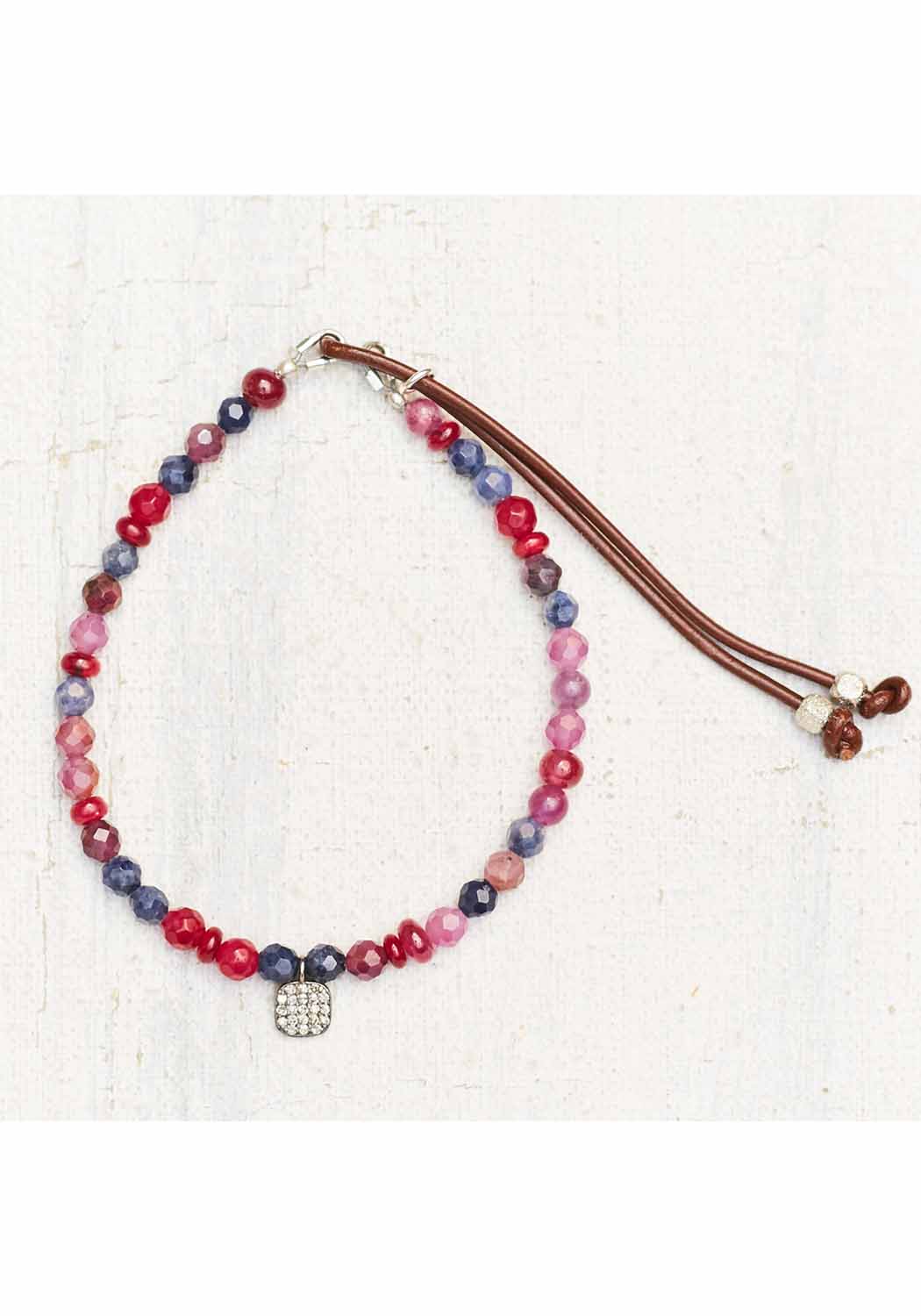 Indulge in the vibrant beauty of the Catherine Michiels beaded bracelet, a stunning amalgamation of faceted and smooth beads of sapphire, ruby, and red agate. This exquisite piece is artfully complemented by a pave-set diamond charm that adds a touch of dazzling brilliance. The bracelet is thoughtfully designed with an adjustable leather tie, complete with stainless steel fastenings, ensuring a flawless fit for any wrist size. This colorful and elegant accessory embodies a blend of luxury and versatility, making it a captivating addition to any jewelry collection. Wear it by itself or in a unique bracelet stack.
