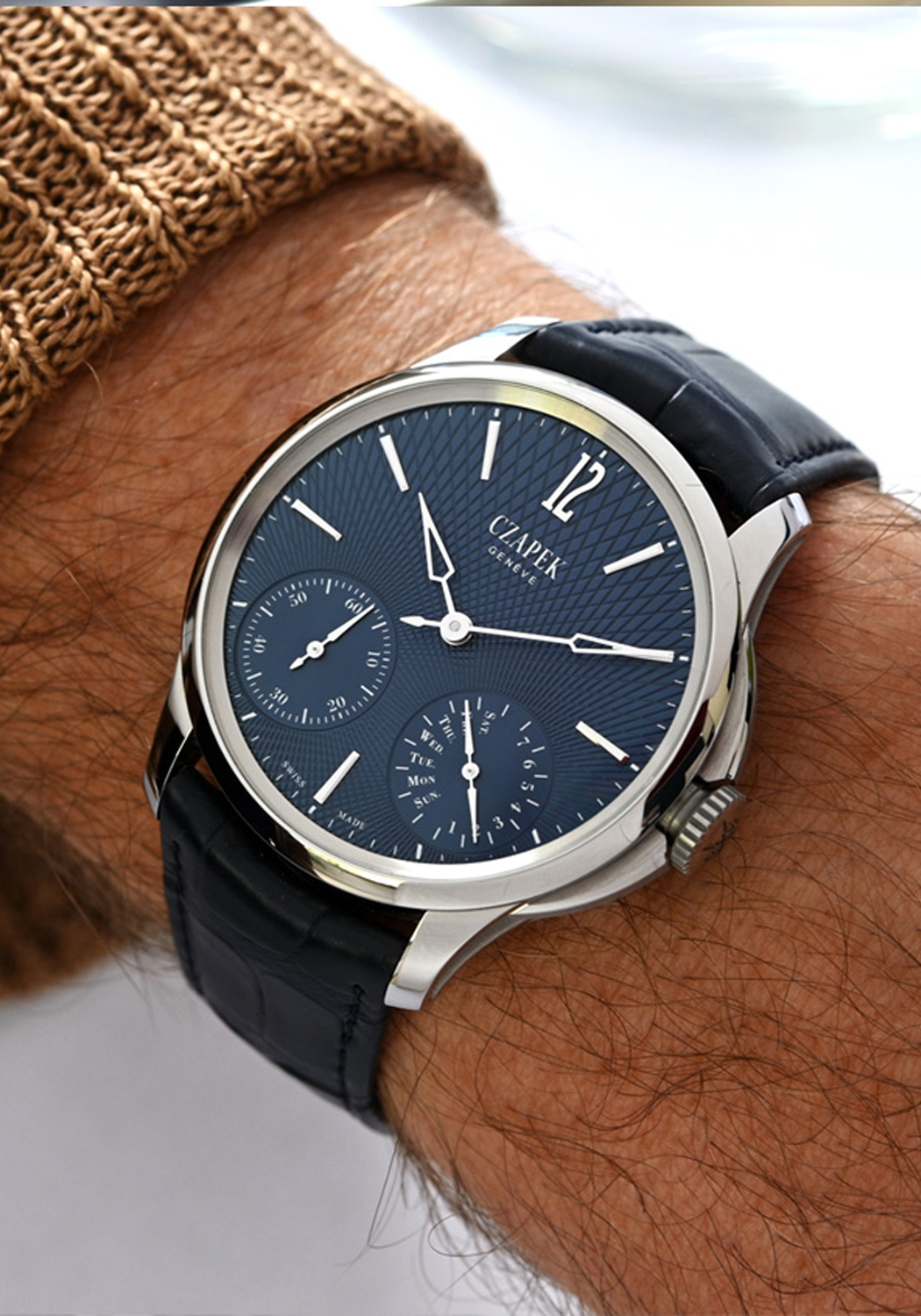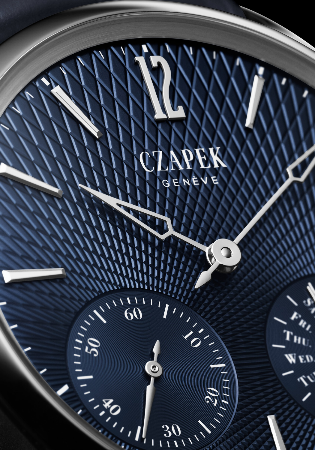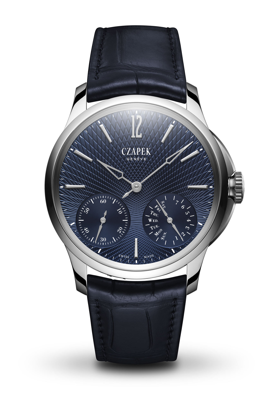 Known for its two sizes, Czapek's Quai des Bergues finds a sweet spot in the middle with the latest release - the 40.5 mm Double Soleil, available in Deep Blue (shown here) or Tuxedo Black. This perfect sized version retains many of the hallmarks of its predecessors, with a few minute changes: a subtle update to the slope of the lugs, and refinement of the case-side recess to allow space for the SXH1 movement. The dial color choices has also been revisited, this time with a bold new guilloché pattern. The Guilloché Double Soleil gains its name from a solar optical illusion that causes the perception of a luminous spot on the sun, known as parhelia or "sun dogs." The design plays a trick on the eye making it difficult to assess whether the lines are radiating inwards or outwards.