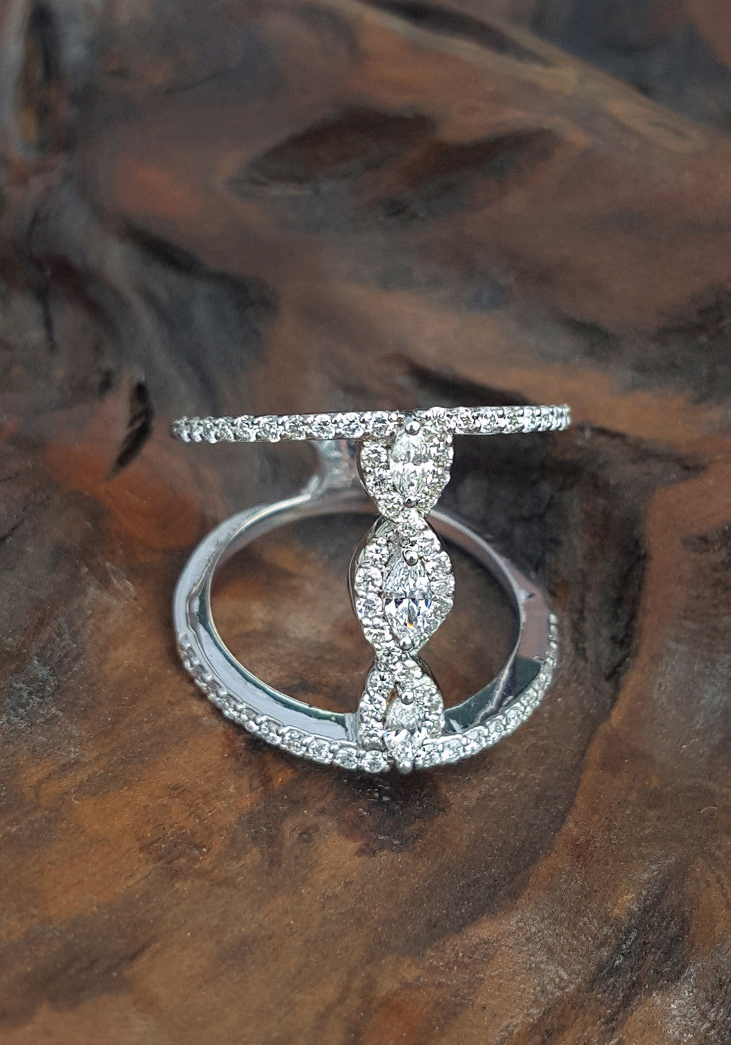 This exquisite piece from the Oster Collection is a true statement of elegance. The 3 diamond bridge double ring beautifully unites two half eternity bands, creating a harmonious blend of brilliance and sophistication. At its center, a stunning triplet of marquise diamonds is embraced by twist of sparkle, amplifying the ring's radiance. Measuring 3/4" in width, this captivating ring is available in a size 6, making it the perfect fit for those who seek to adorn their fingers with timeless beauty.
