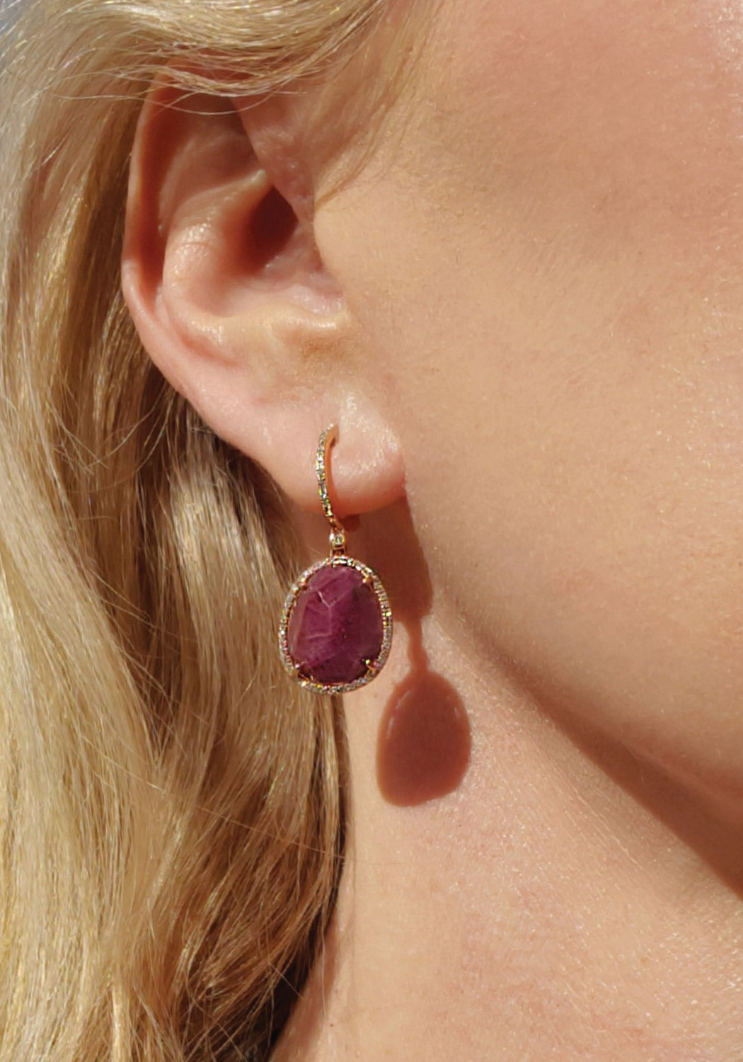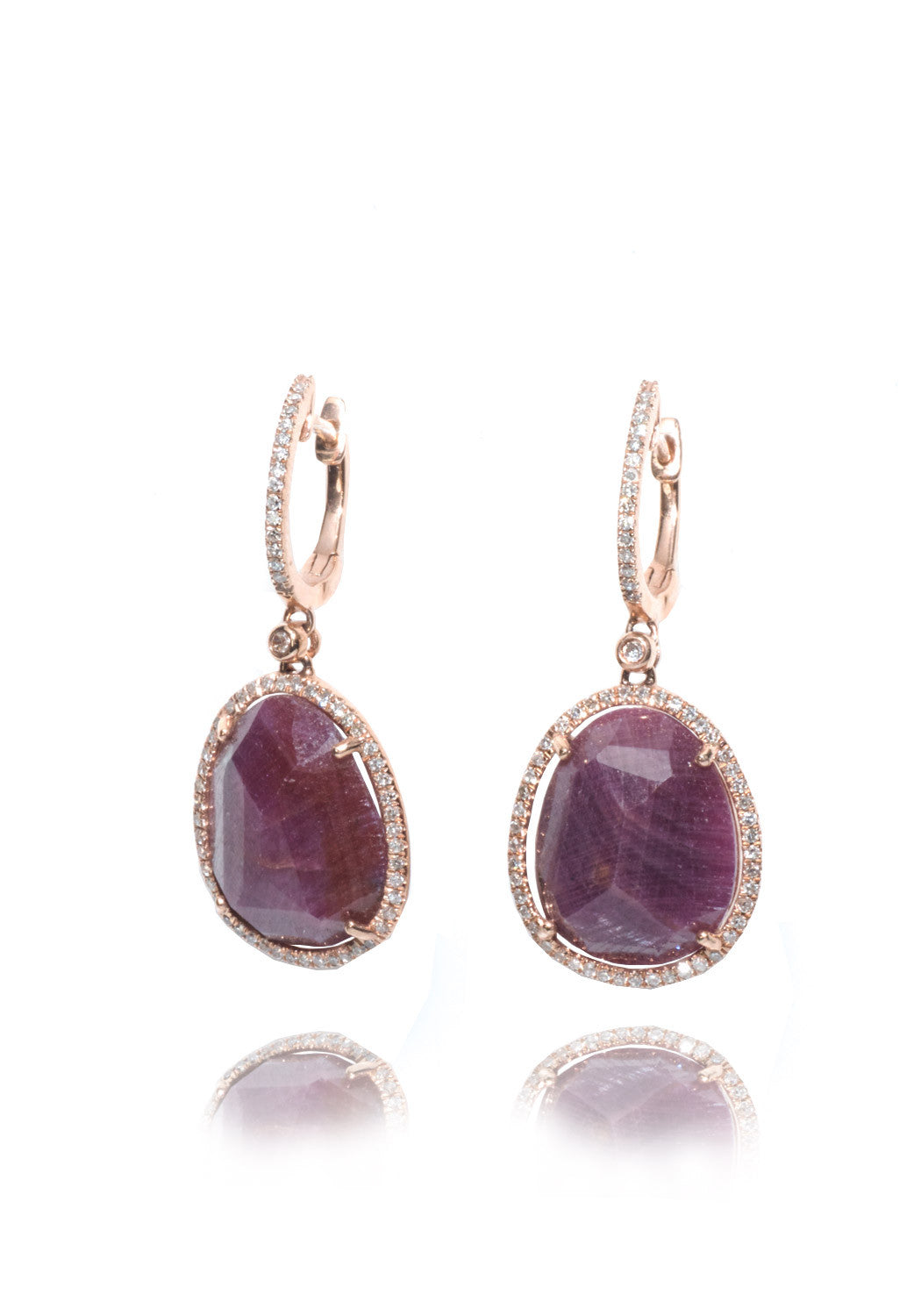 Decadent blood red rubies glisten against warm 14k rose gold and sparkling diamonds on these captivating ruby dangle earrings. The incredible faceted pear shaped rubies are hugged by a micro halo of brilliant white diamonds, while delicate movement is allowed by the pavé diamond huggie hoops the rubies are suspended from. Measuring 1.25" long, they're the perfect length to bring dynamic sparkle and a pop of color that stands out from the rest.