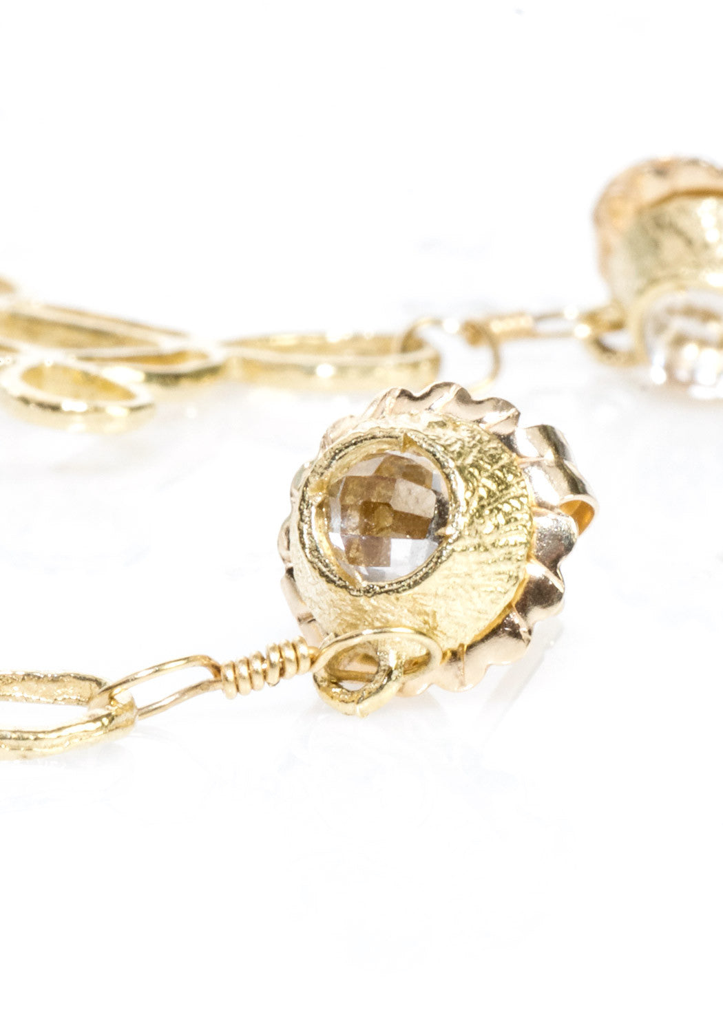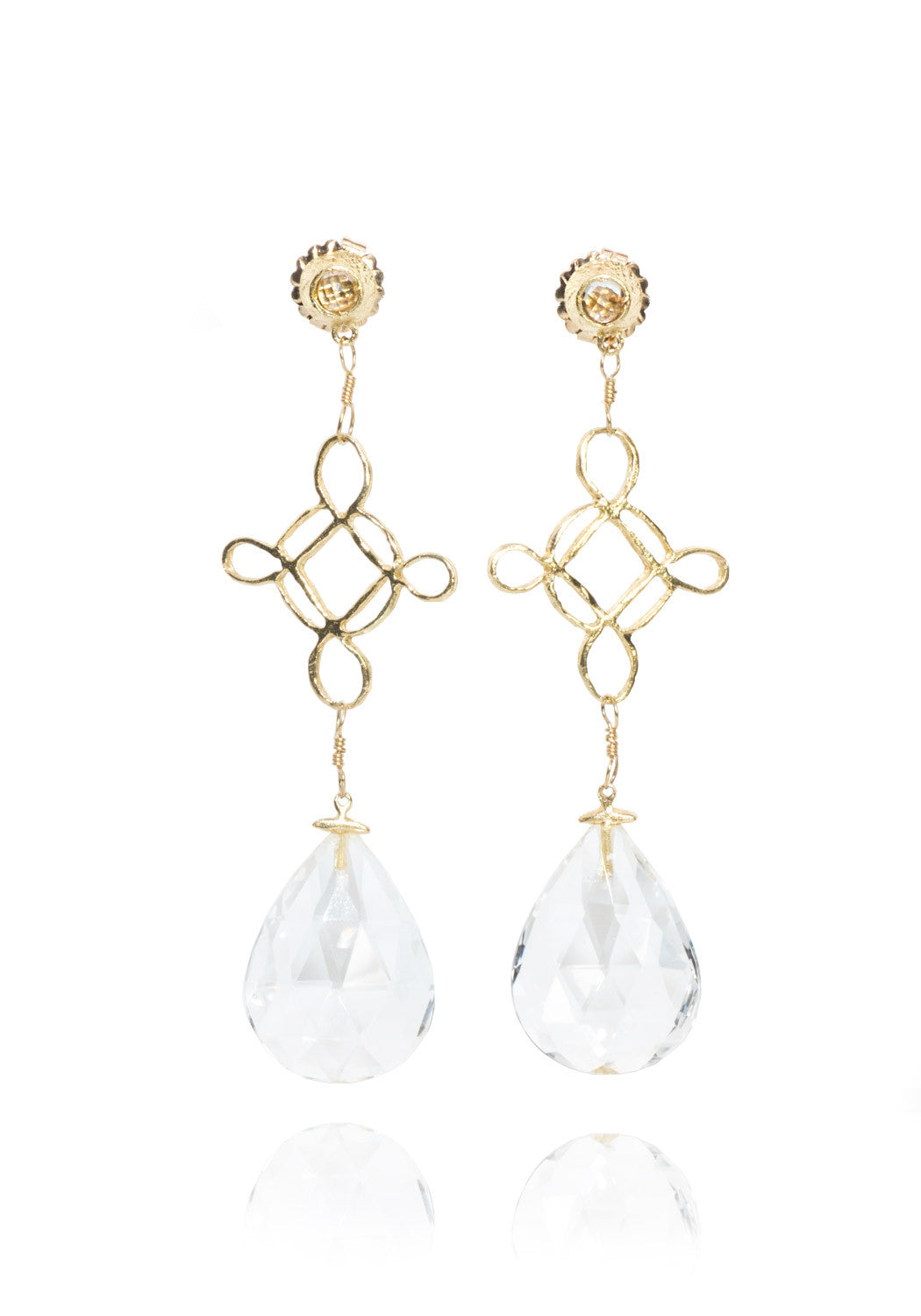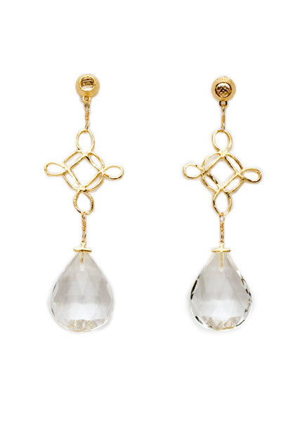 Precious faceted white topaz drops are effortlessly suspended from intricate 18k yellow gold loops on these striking dangle earrings by Dominique Cohen. White Topaz complements any look and brings a sophisticated silhouette to the ears. These gorgeous earrings measure 3" in length and are .75" at their widest, and secure with a post back.