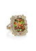 An absolute show-stopper, this sensational one-of-a-kind cocktail ring by Erica Courtney features an impressive 19.19 carat rare zultanite stone accented with 18k rose gold and pavé diamond filigree flourishes. A transformative stone, the vibrant zultanite flashes between champagne and tangerine hues with sparks of meadow green as it catches the light. Four pretty in pink sapphire stones complement the alternating hues of the zultanite. This truly unique and incredible cocktail ring is a work of art for the fingers.