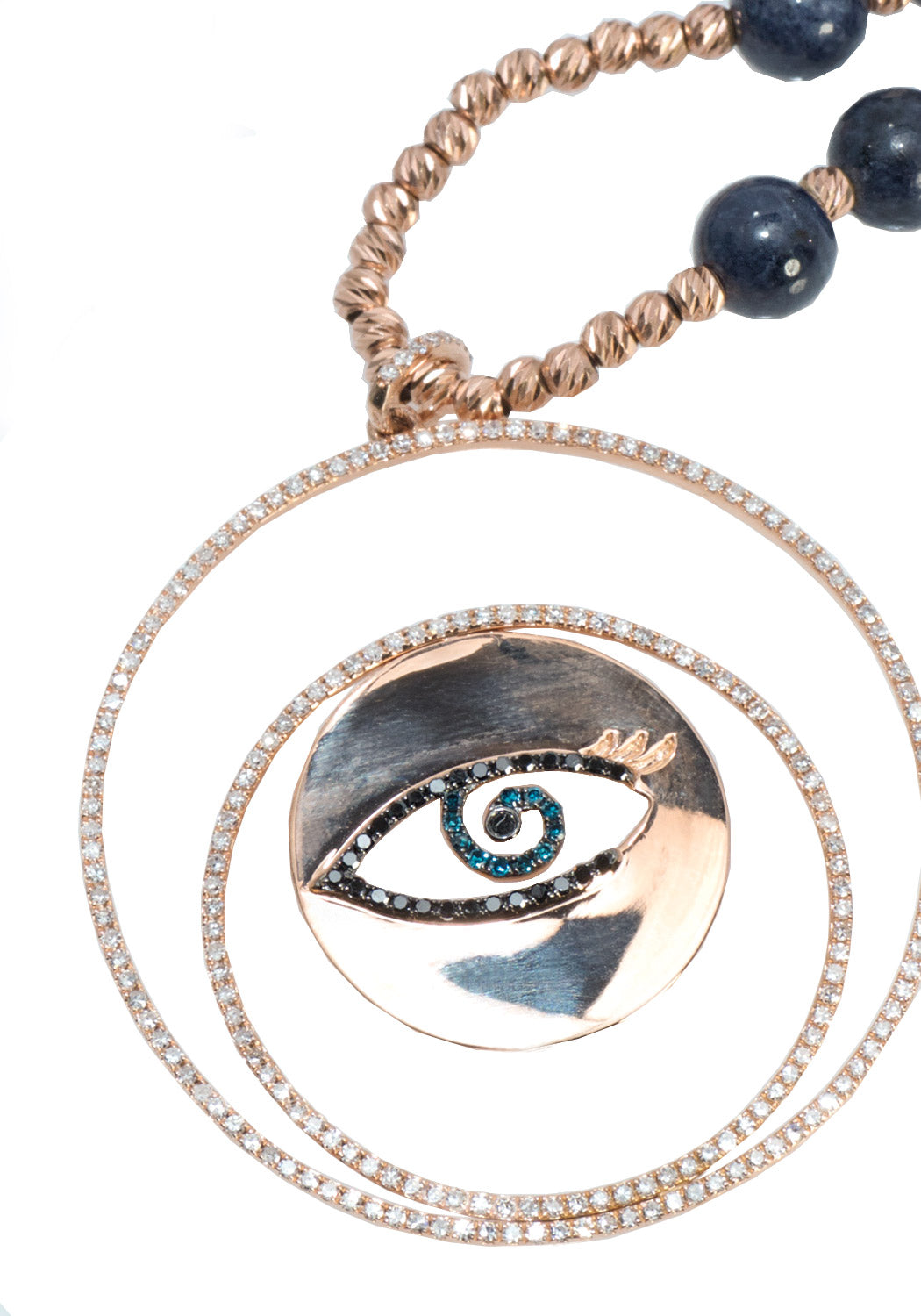 Anatol's Sapphire and 18K rose gold bead necklace reimagines the traditional evil eye talisman with a chic twist. This striking piece features an eye motif meticulously outlined in radiant blue sapphires, set against a backdrop of a 1.5" diameter disc encircled by .71 carats of sparkling white diamonds. The 18k rose gold and sapphire bead necklace extends gracefully at 38" long, making it a versatile and stylish statement piece. Embrace this contemporary take on a classic symbol of protection, crafted to add a touch of sophistication and mystique to any ensemble.