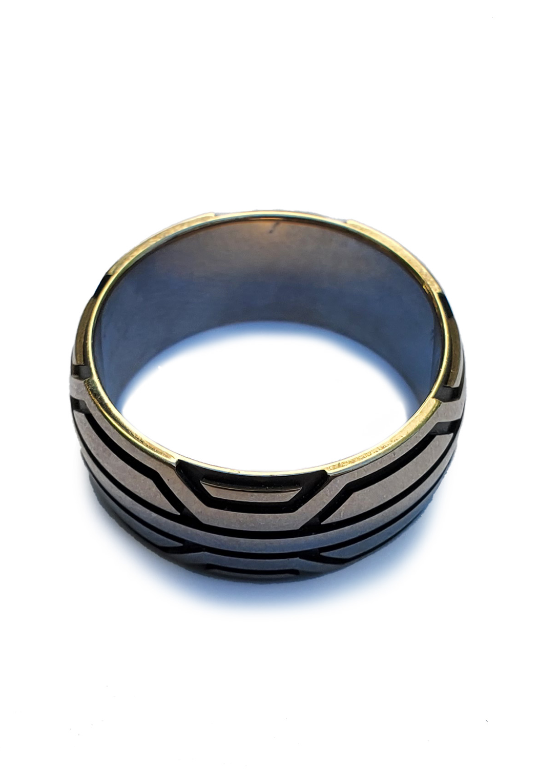 Black lustrous anthracite winds expertly throughout decadent 18k White gold on this intriguing geometric engraved men's wedding band by Furrer Jacot. Measuring 9mm, this 18k white gold and anthracite geometric band makes for a wonderful wedding band or an exciting every day ring with its unique thoughtful design. SHOWN IN ROSE GOLD