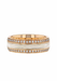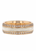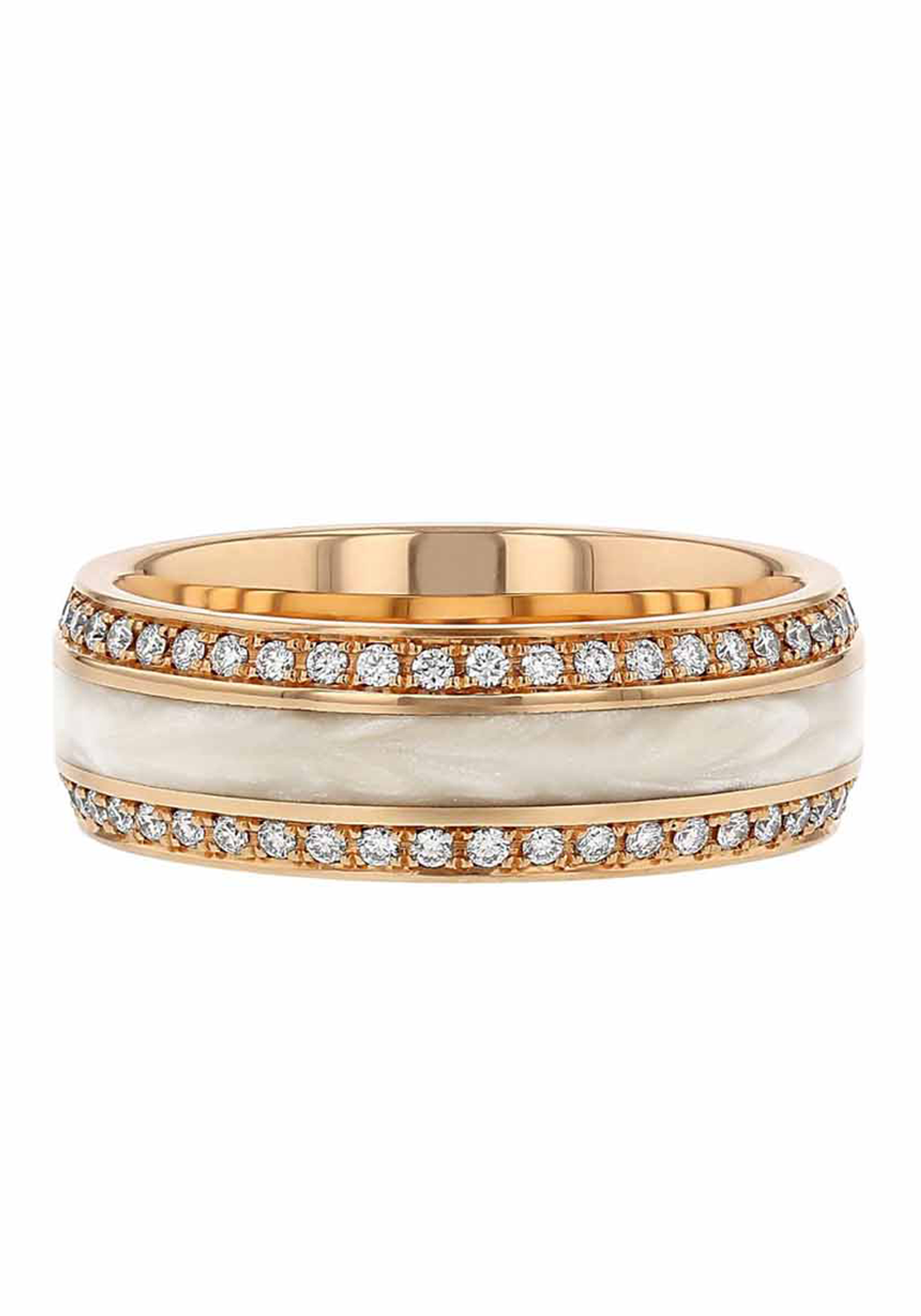 Sensuous HyCeram is hugged by ribbons of diamonds set in 18k rose gold on this double diamond eternity band by Furrer Jacot. HyCeram is an innovative hybrid ceramic/polymer compound that adds an understated elegance with its cream marble-like color. This ring was custom made for Oster Jewelers, so the photos may show slight variations.