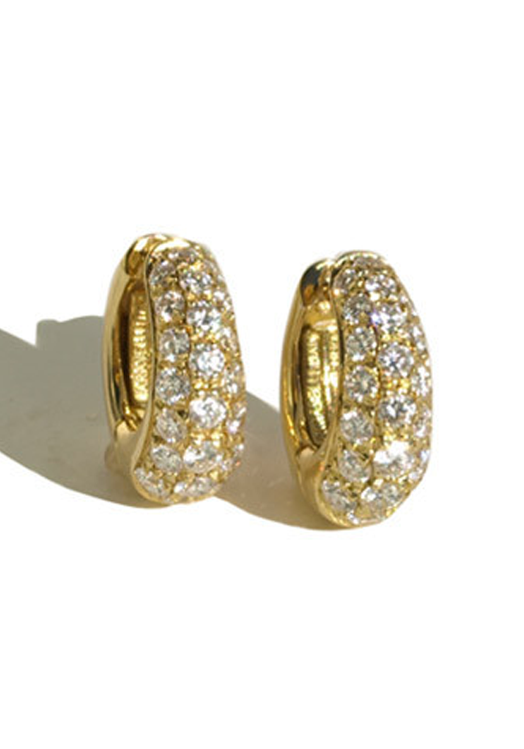 These stunning Garavelli 18k yellow gold diamond huggie earrings sparkle with exuberance and are the perfect every day accessory. Their hinged back and 1/2" diameter size makes these pavé diamond encrusted huggies an effortless glamour must have for every outfit and occasion. Style with a gorgeous chain necklace.
